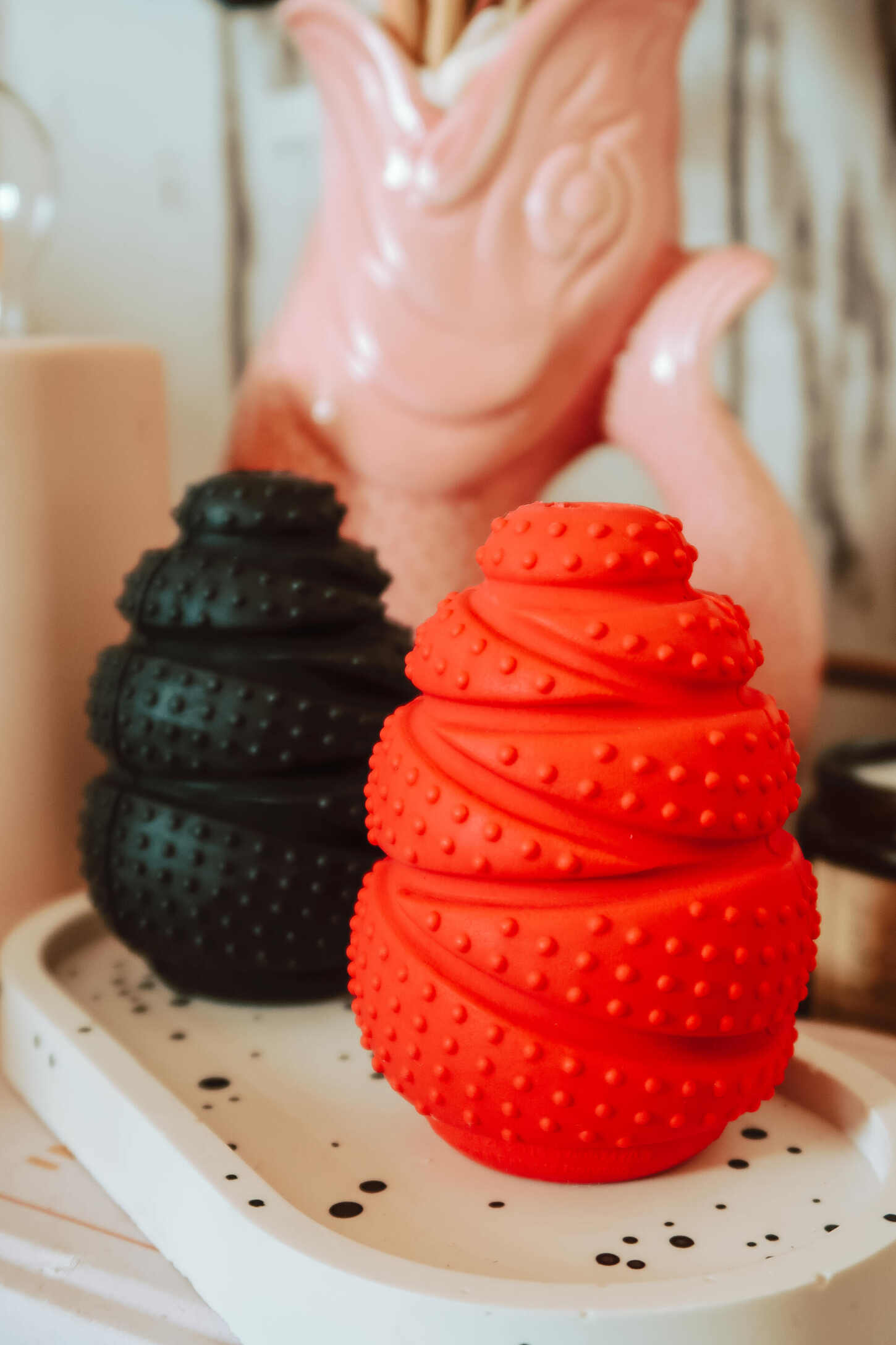 Now, with Kong, the black rubber toys are tougher than the red, but I couldn’t tell any difference between the durability of the red and black Tough Stuff toys. I bought the Scamps one of each colour – a black and red tyre, and a black and red treat dispenser.