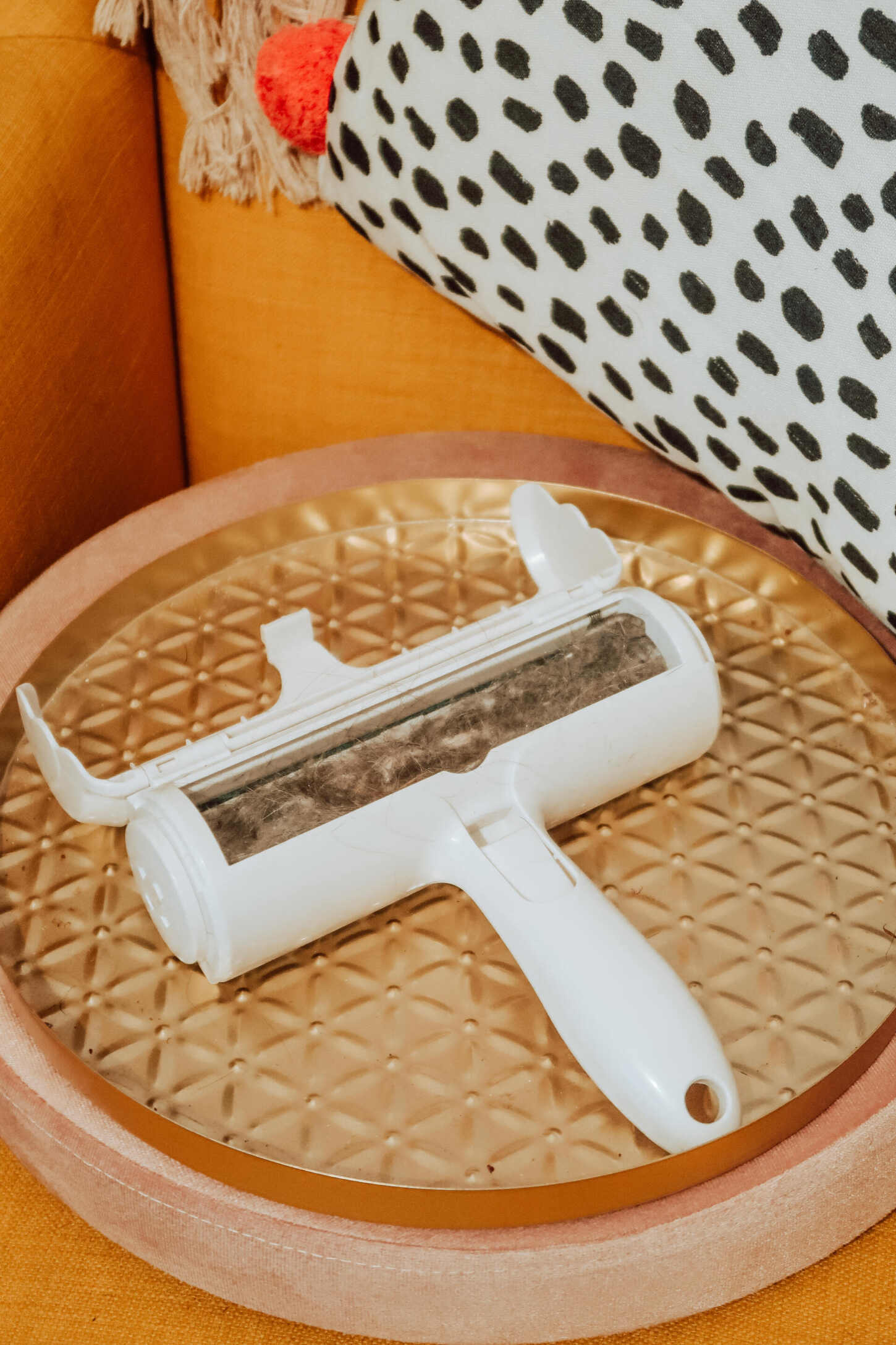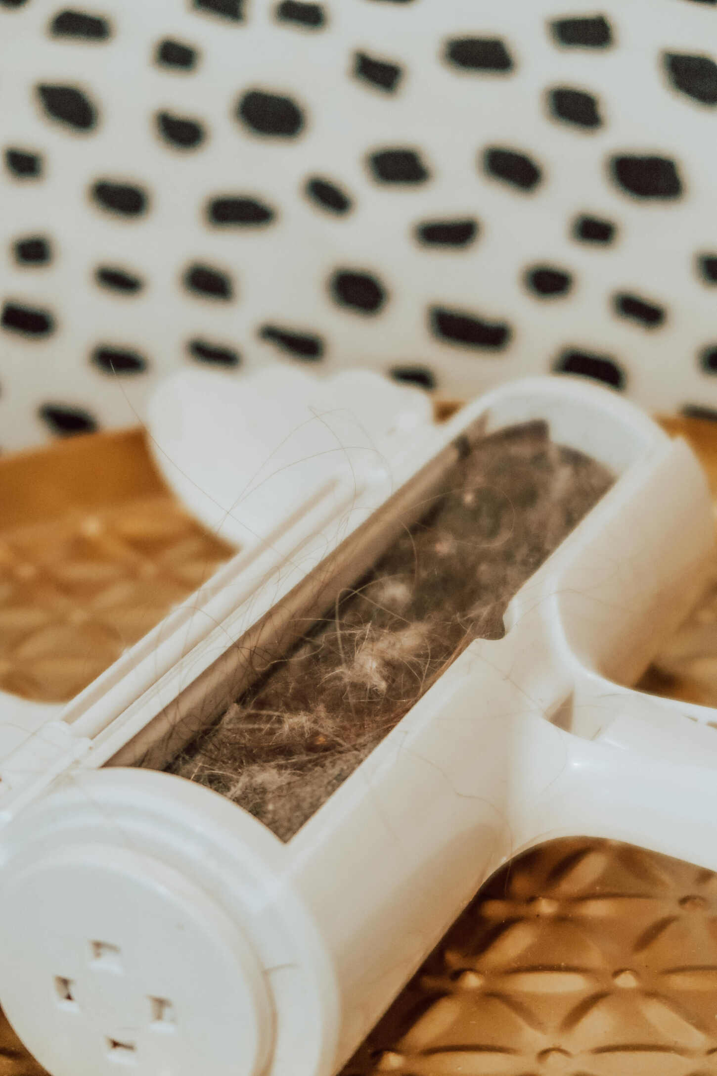 I decided to test the roller on my yellow armchair, which The Scamps rarely sit on, but there were a few pet hairs on it from taking pictures of them in previous weeks. The roller only rotates until the rubber strips hit either the top or bottom of the roller, so around 150 degrees, but this is what allows the hair to collect in the back. It feels strange to use at first, with the friction of rubber on fabric, but you soon get into a rhythm and can tell you’re doing the job right. The handle has been ergonomically designed, and it does feel pretty comfortable to hold, you just have to be quite vigorous with it.