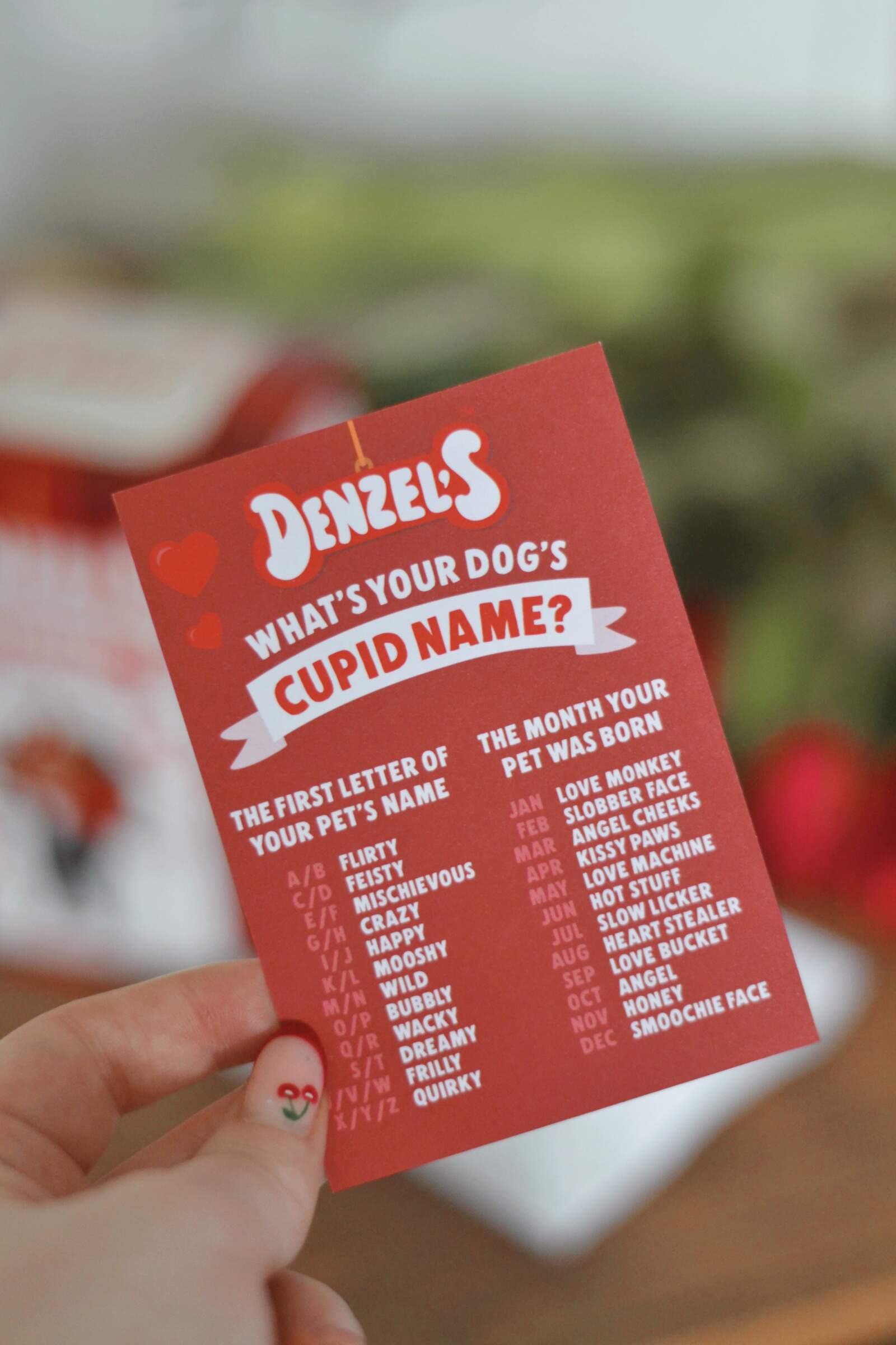 As well as the game and its instructions, the Blind Date gift features a built-in label that reads ‘be mine?’ with space to write to and from. Inside, there’s even a Valentine’s card from Denzel, as well as a secondary game where you can work out your dog’s ‘Cupid name’ based on the first letter of their name and the month they were born.