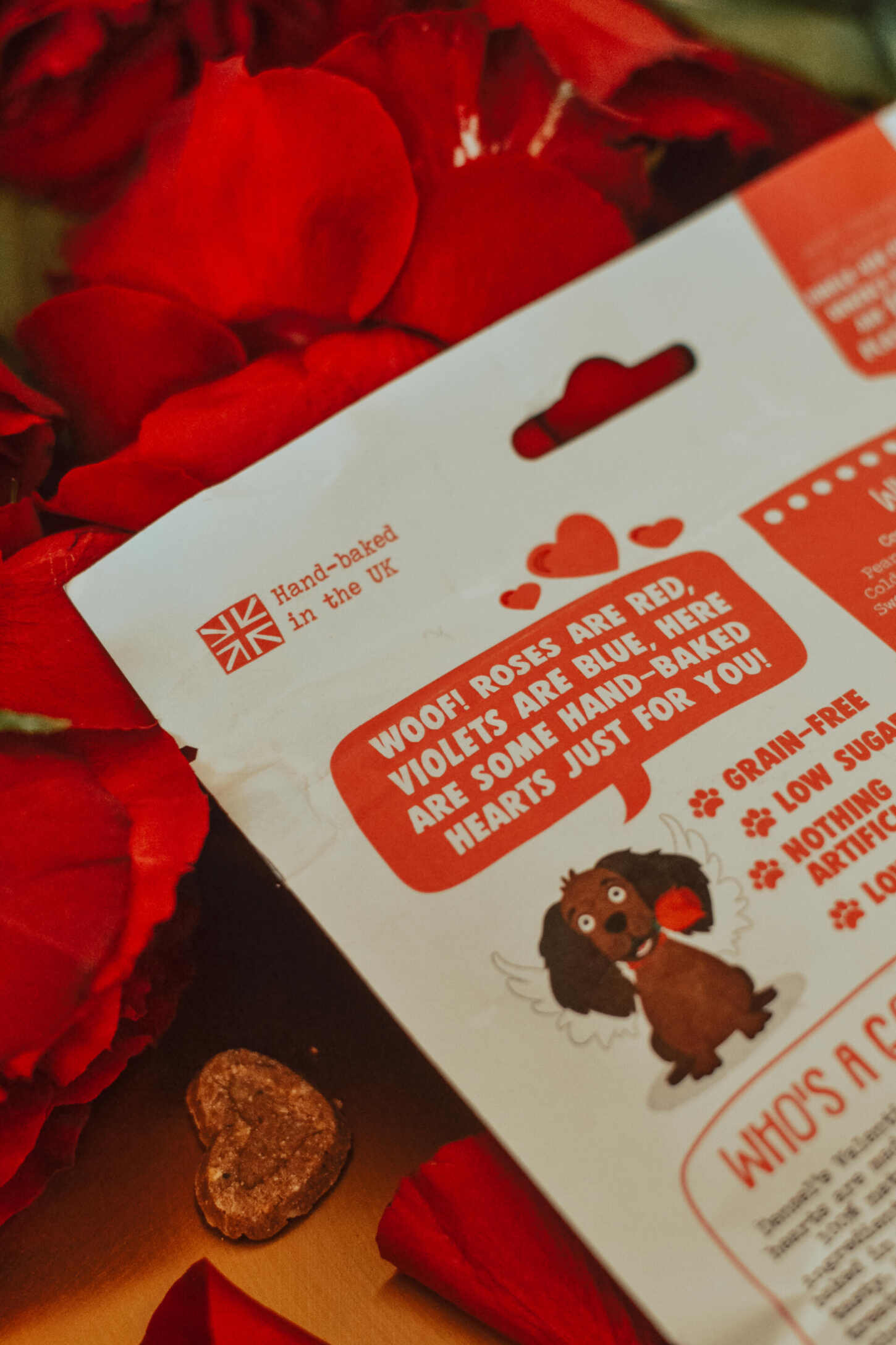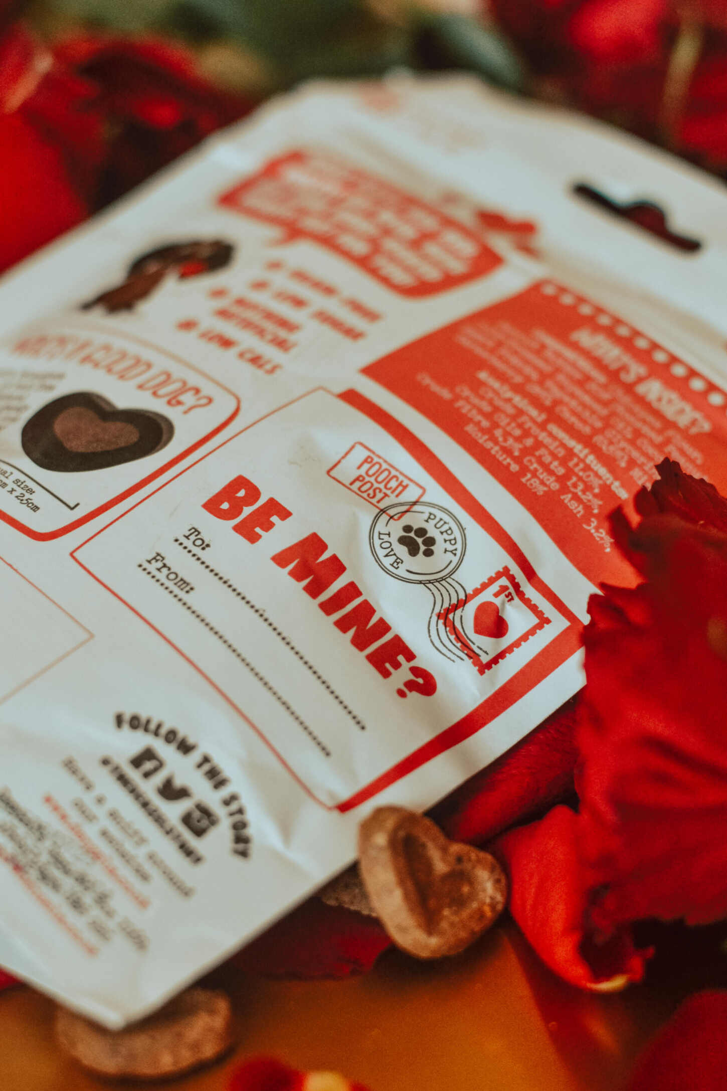 The plastic-free pouch even has a message from Denzel which reads: “Roses are red, violets are blue, here are some hand-baked hearts just for you!” with a pooch post envelope stamped Be Mine? with space to write the name of a sender and recipient.