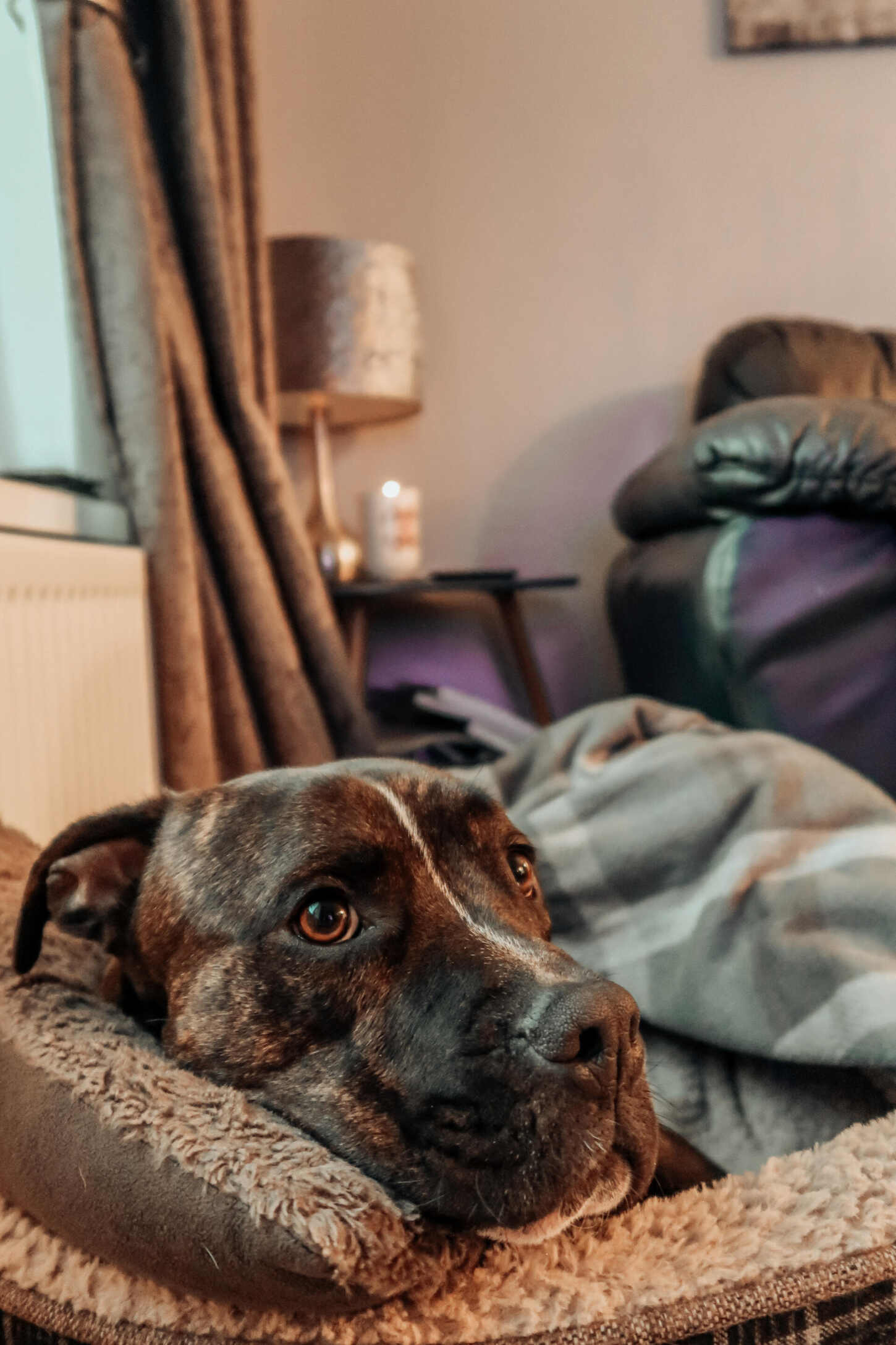Our previous Staffordshire Bull Terrier, Lyla, would cower behind or under whatever piece of furniture she could squeeze under during storms and fireworks. It can be an incredibly stressful time for them.
