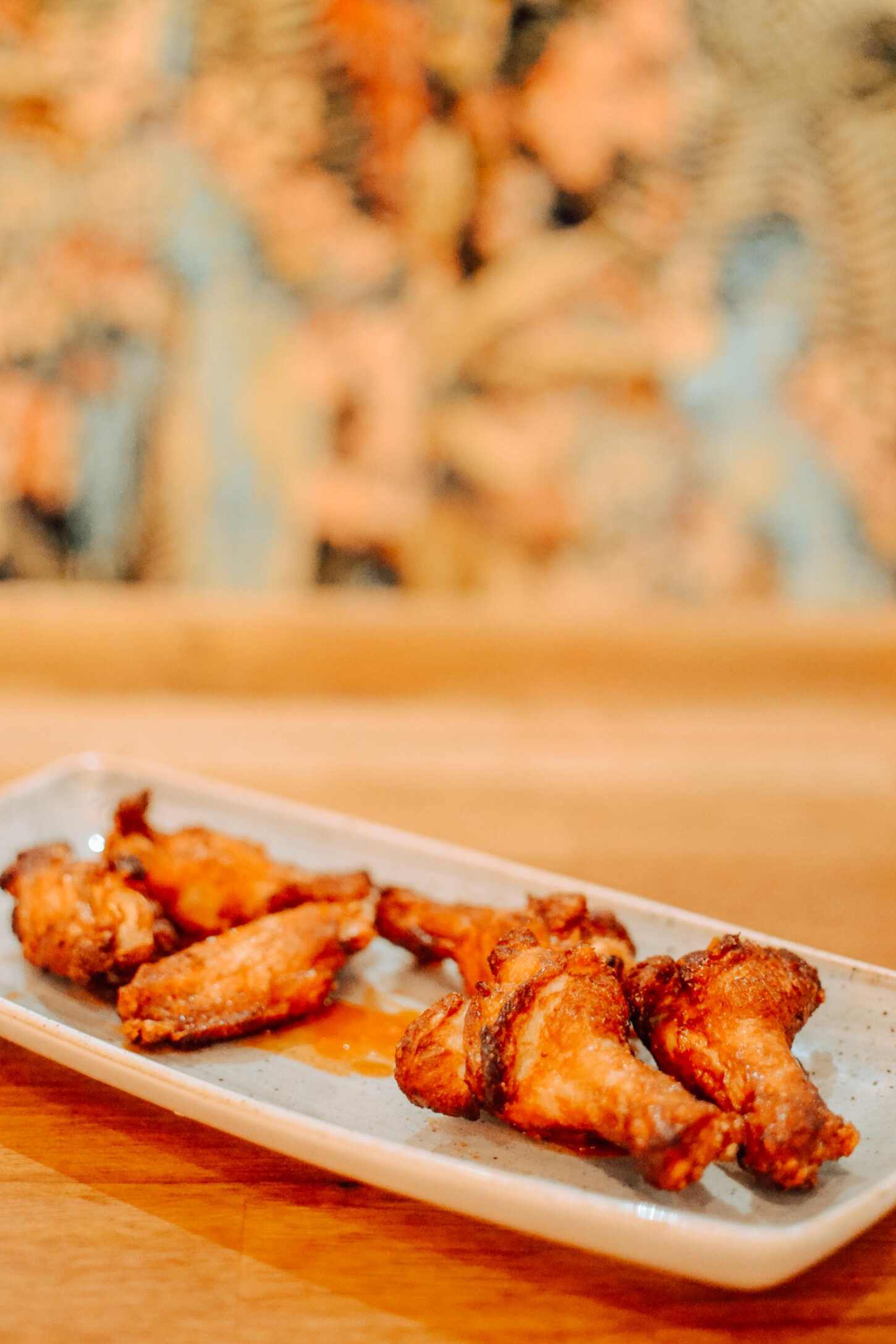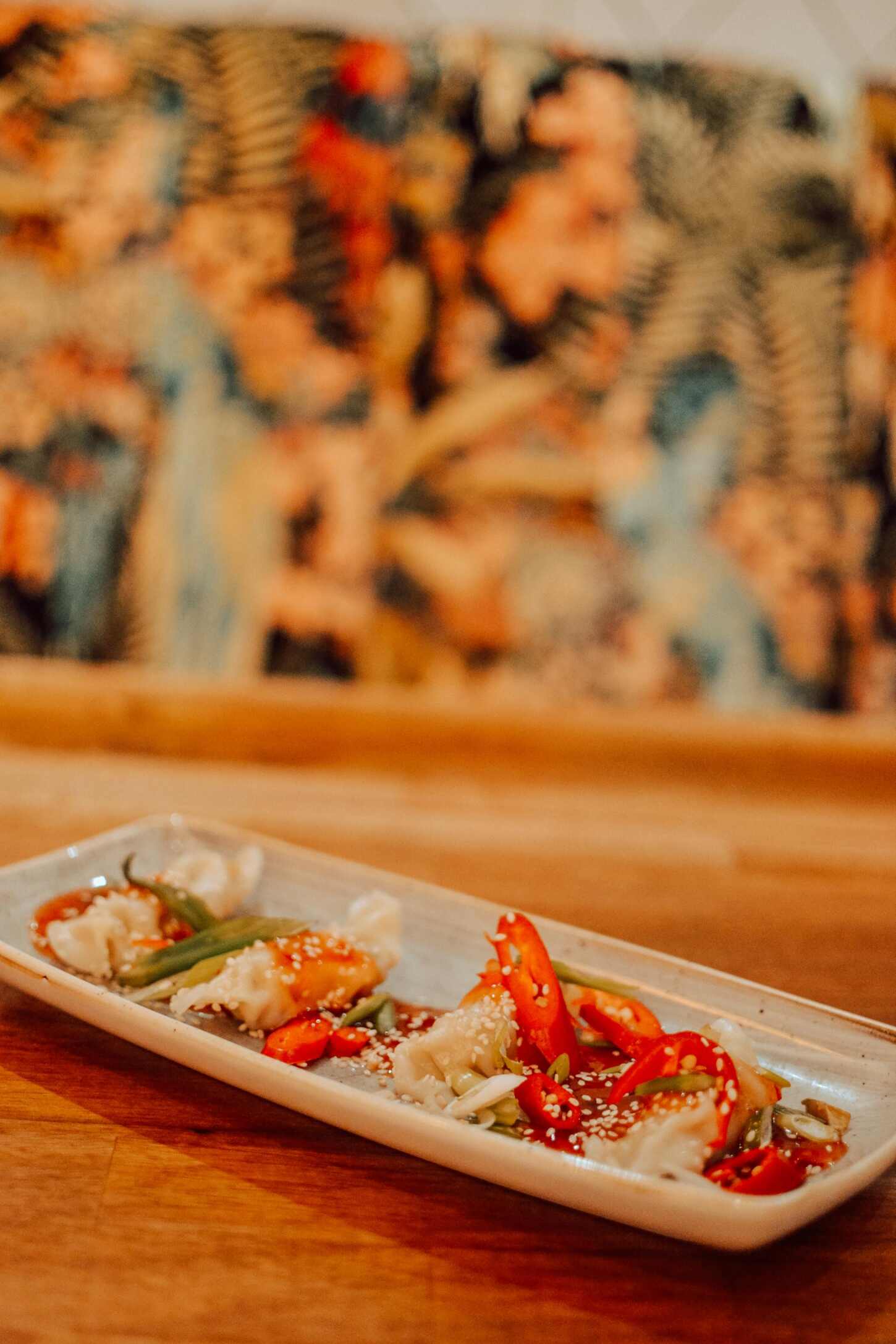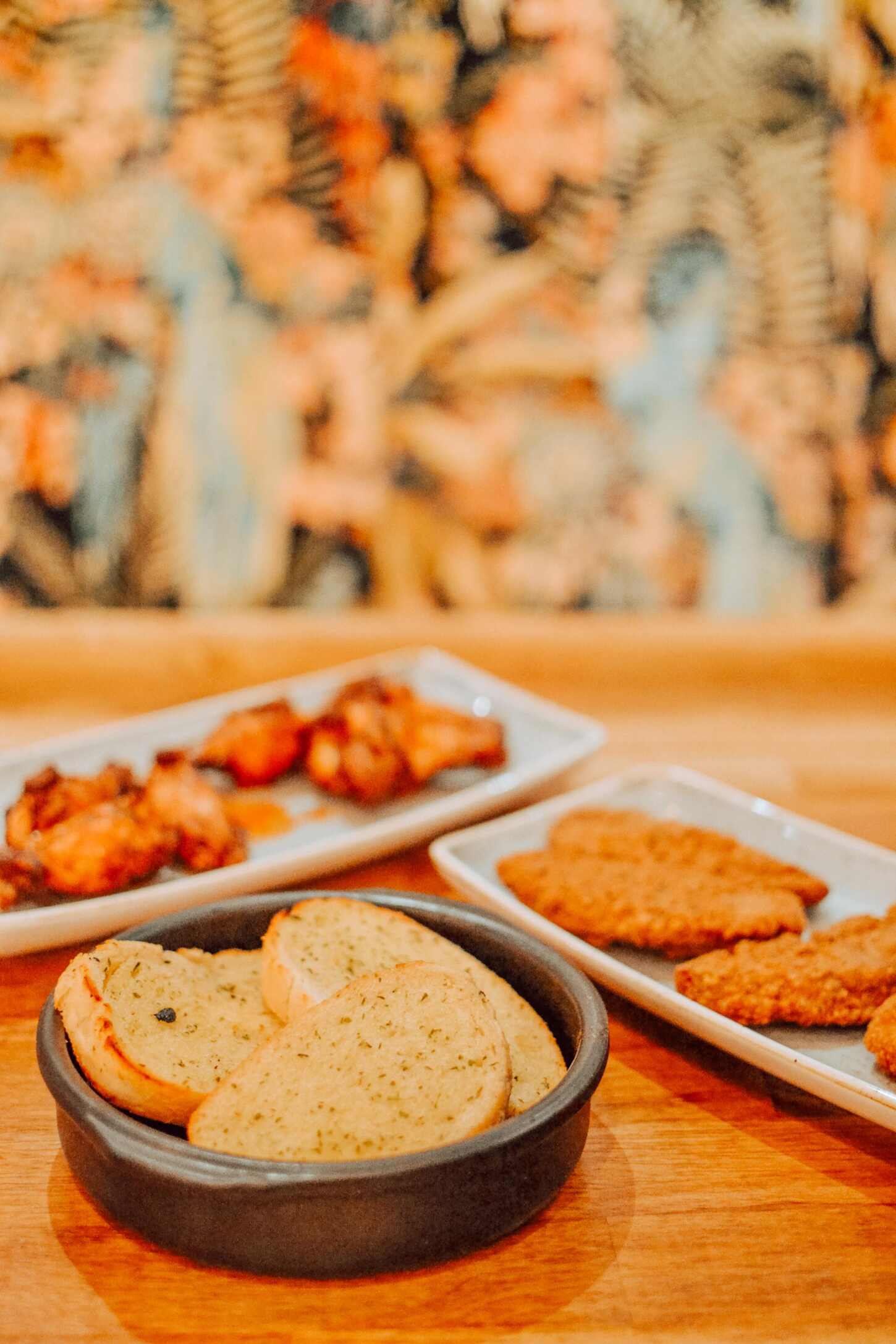 We ordered our food using the app, so if dining alone, there’s no need to take the dogs up to the bar. With two-for-one cocktails, it would have been rude not to, so I ordered two Berry Nice fizz’s, which featured blackberry gin, vanilla syrup and soda, which was super refreshing after walking through town. We decided to order a mixture of nibbles, including garlic tiger bread, southern fried chicken goujions, chicken wings and gyoza chicken dumplings between us.