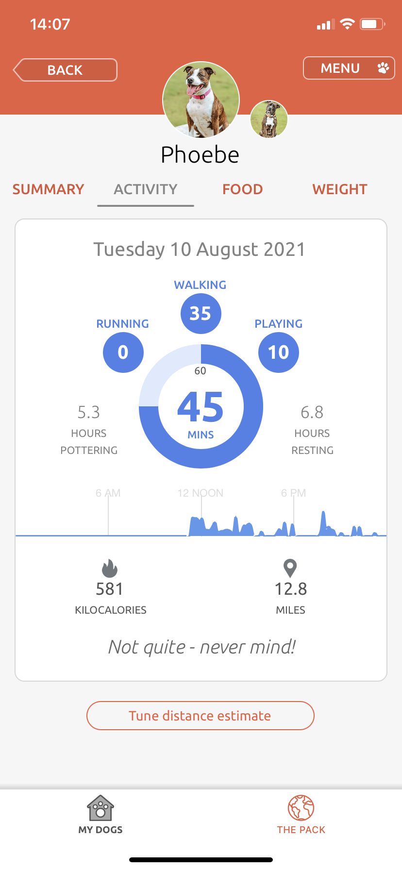 On their first day, the PitPat said Phoebe had walked for 35 minutes, and spent 10 minutes playing – which was pretty accurate. It added that she’d done 5.3 hours of pottering about and 6.8 hours resting. Overall, she’d walked 12.8 miles, burning 581 kilocalories.