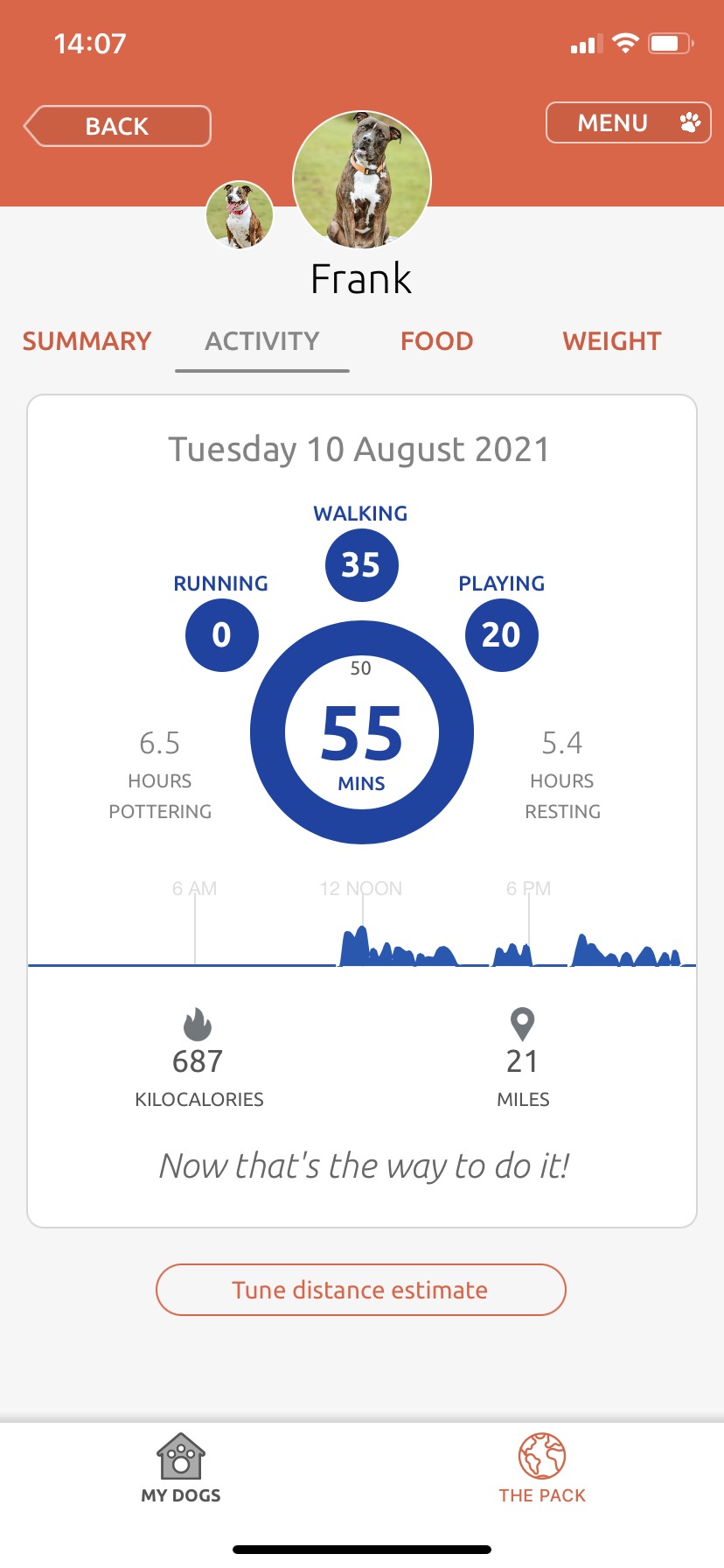 Frank walked for the same amount of time as Phoebe in the day, with 20 minutes of playing, suggesting he did a bit more running around the garden than she did. He also did 6.5 hours of pottering, and less resting than Phoebs at 5.4 hours. The app said he’d walked a whopping 21 miles throughout the day, burning 687 kilocalories.