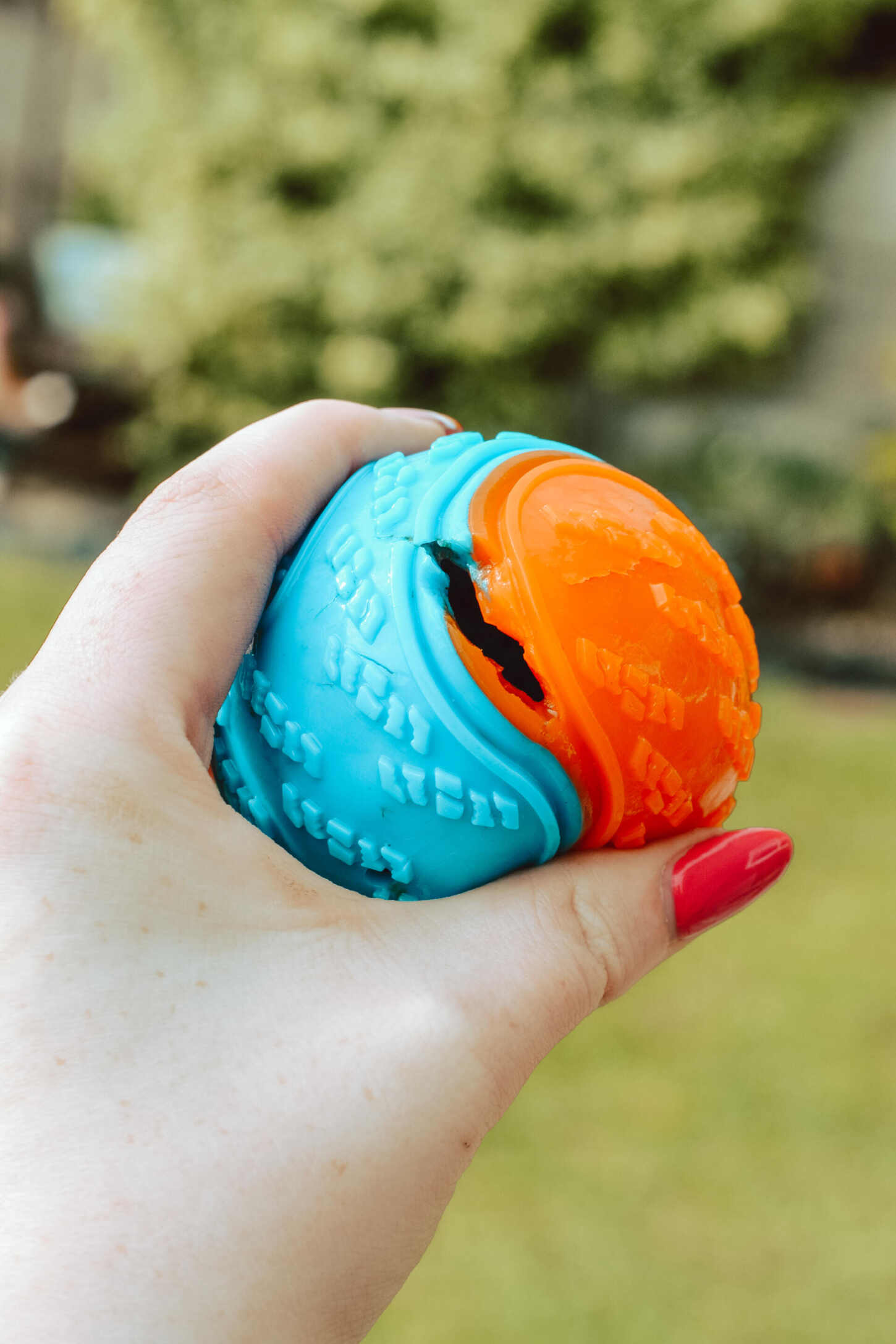 Phoebe loved hers so much she kept trying to bury it for later, and was trotting around the garden very proud of her latest possession. Frank was very excited by the squeaker, and enjoyed a game of fetch around the lawn. After half an hour, it looked as though it was about to rain so we collected the balls and headed back inside. As we had recently mowed the grass, cuttings had clung to the dog slobber, but it washed off really easily with a quick rinse under the tap. Phoebe’s ball was still fully in tact, but Frank had managed to split his, as he is quite an aggressive chewer. I’m not a fan of that term – I prefer ‘over-enthusiastic chewer’.