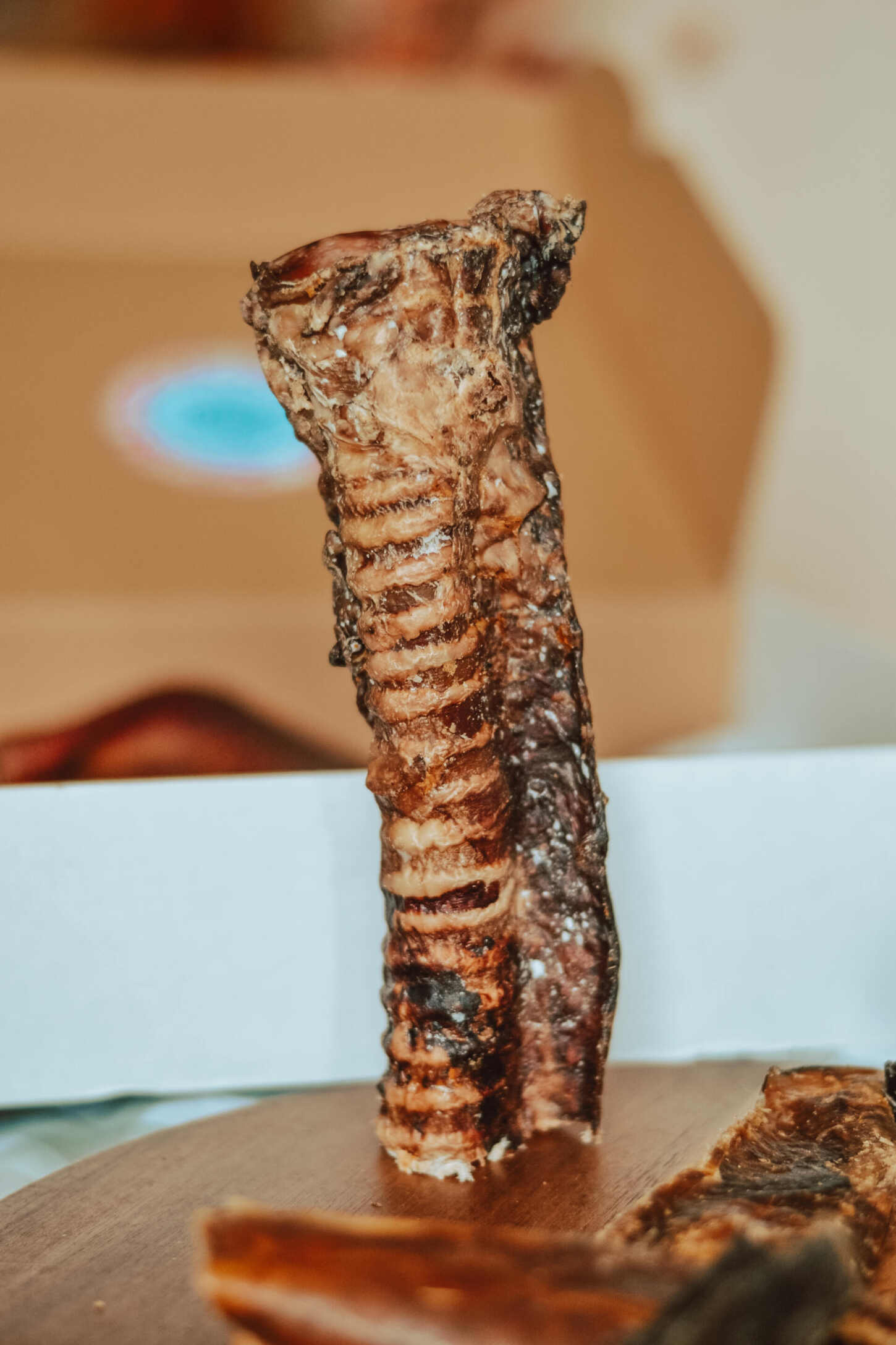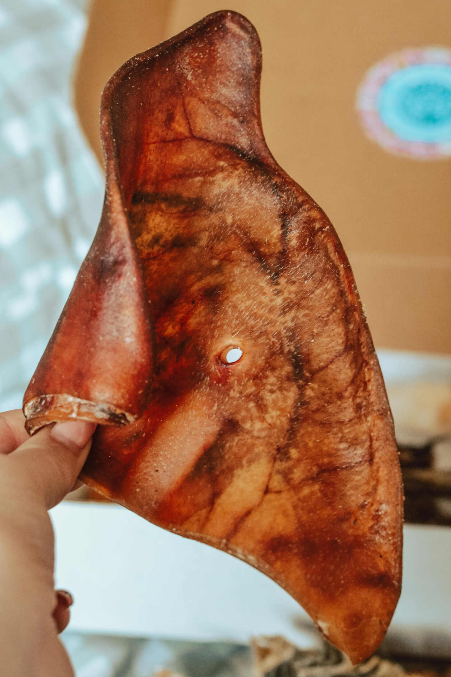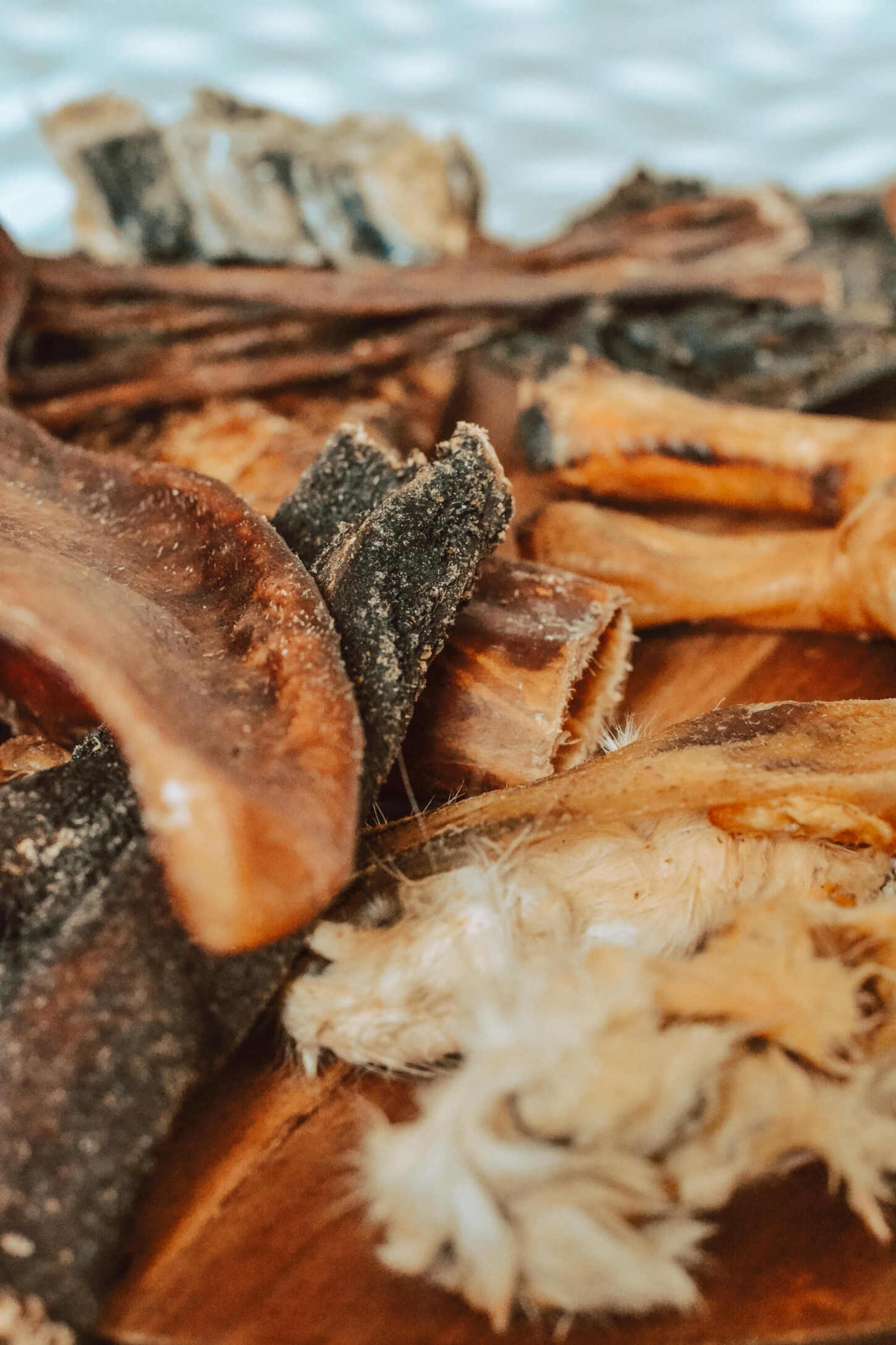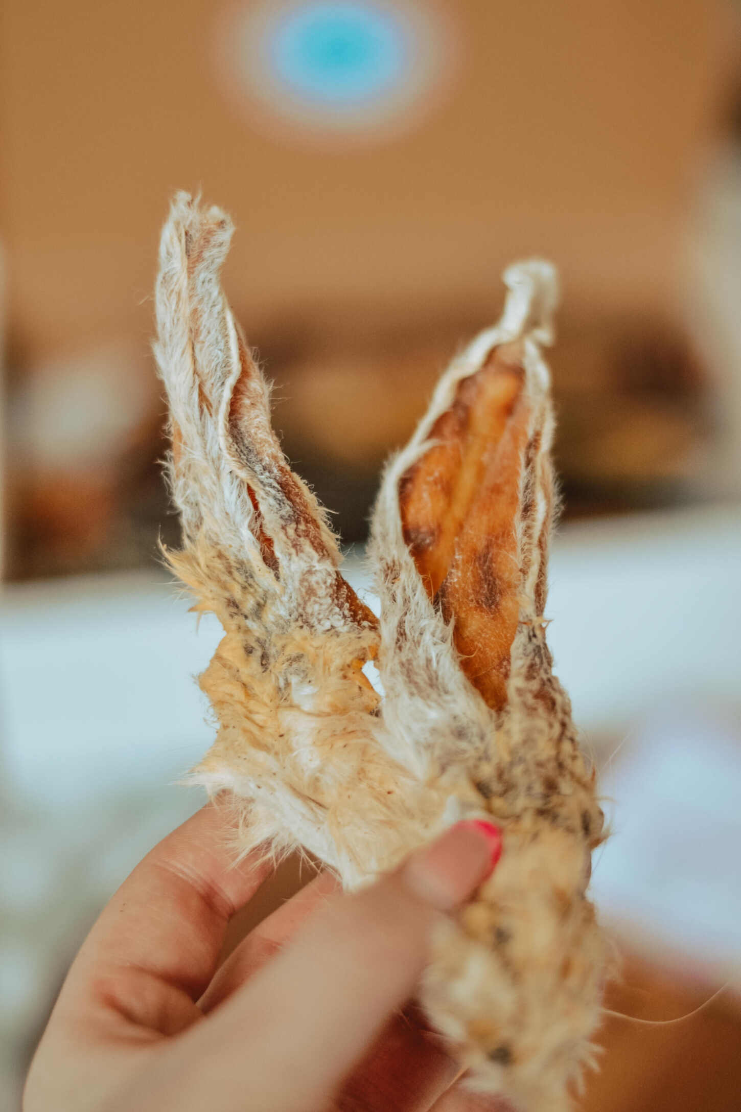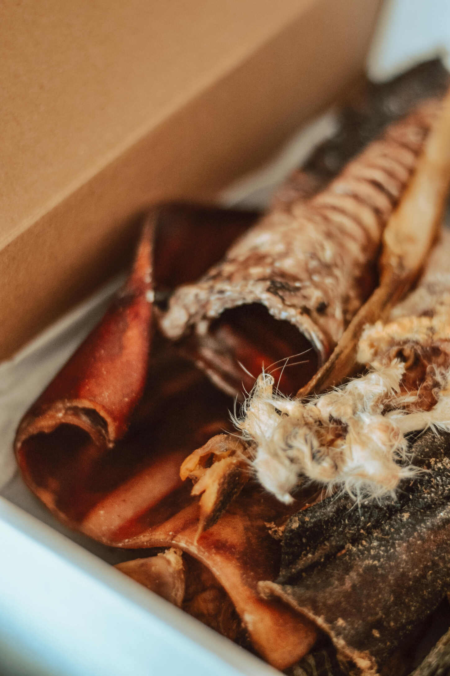 Our box contained a beef trachea and pigs ear, two rabbit ears and two rabbit ears with fur, as well as a pig snout and cow snout – all of which are 100% meat and high in protein. We also identified some fish sticks and two chicken feet, but that’s when our expertise ran out and we were uncertain of the rest of the items. We think there was some lamb spaghetti, which also could have been small pieces of buffalo skin, as well as a potential beef tail end and moon bone.