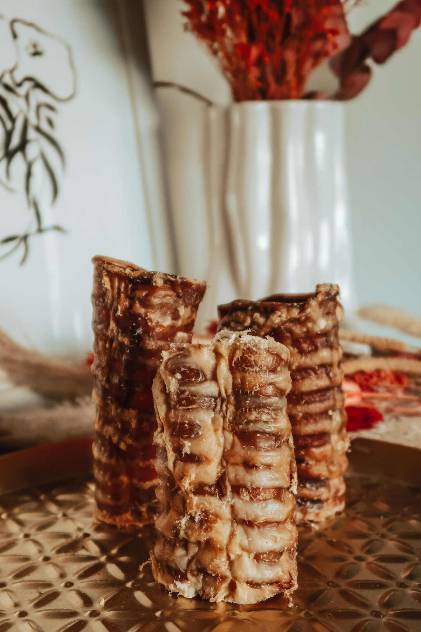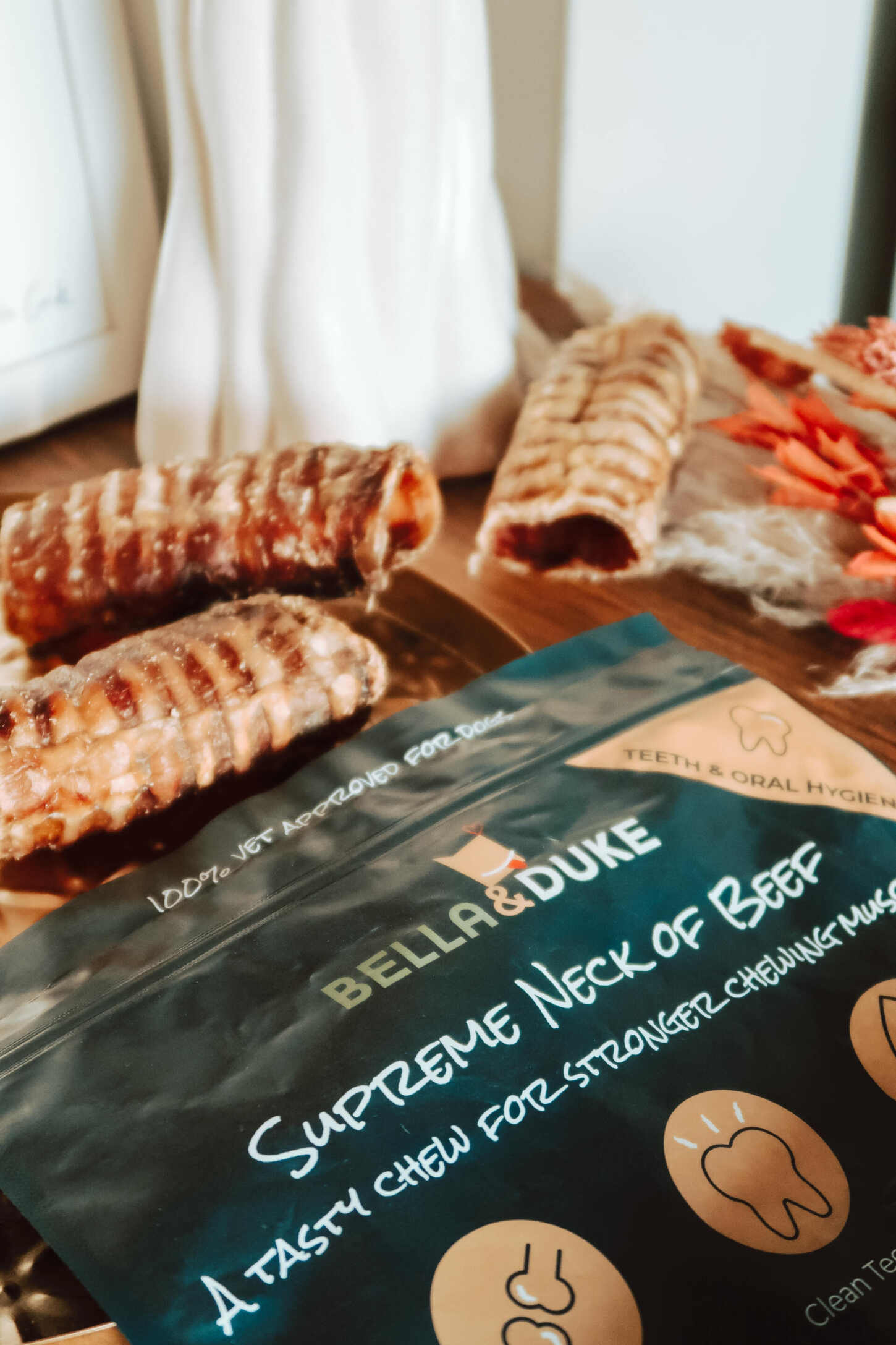 The Supreme Neck of Beef was not something the Scamps had ever tried before, and not something I’ve spotted in local pet stores, so we were really excited to try these. The hollow trachea rings are 100% natural and air dried; due to the naturally occurring glucosamine in the grain-free chew, they’re great for joint care, as well as being high in protein, and low in fat. There were three necks inside the packet, meaning one for Phoebe, one for Frank, and we saved the spare for Winston.