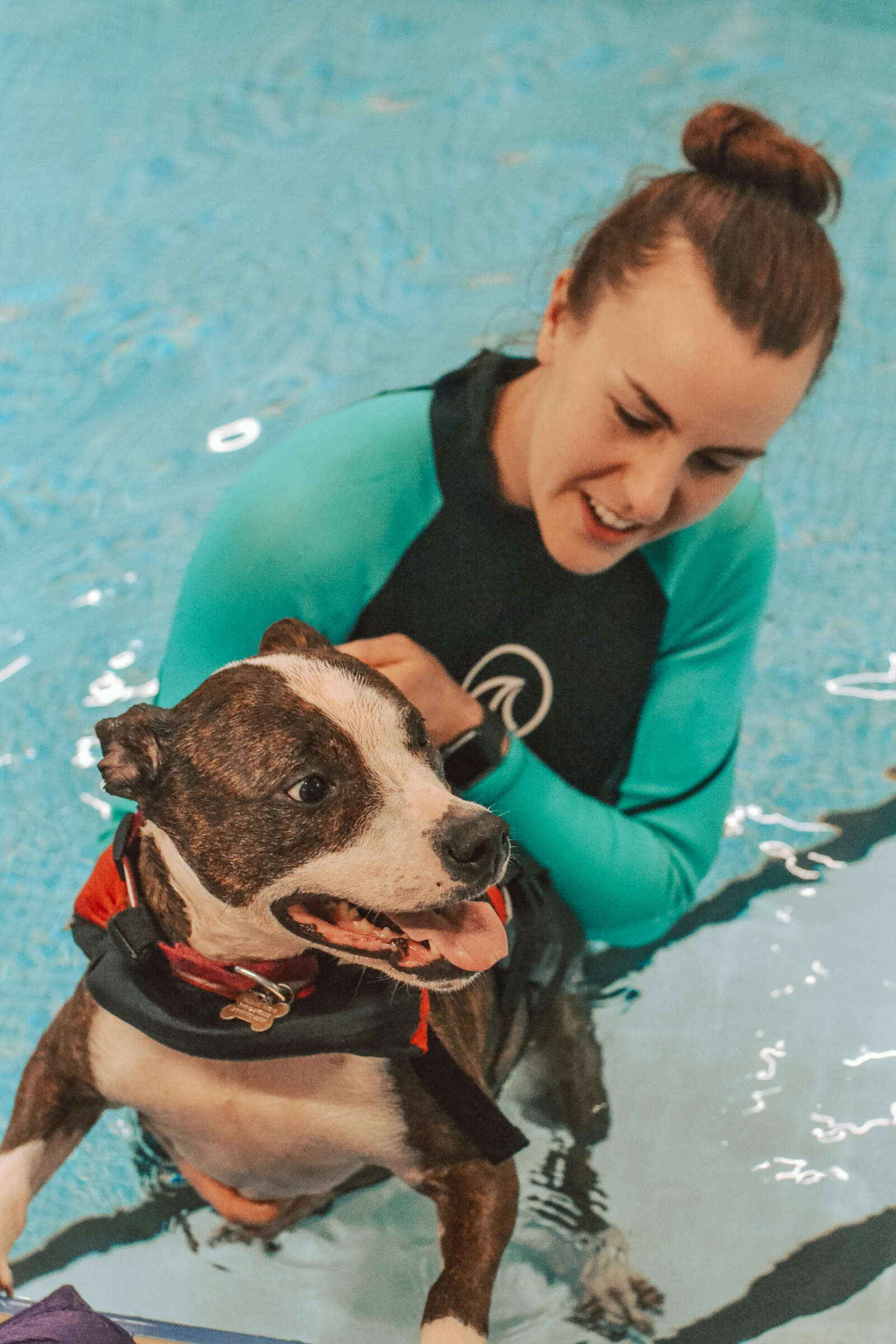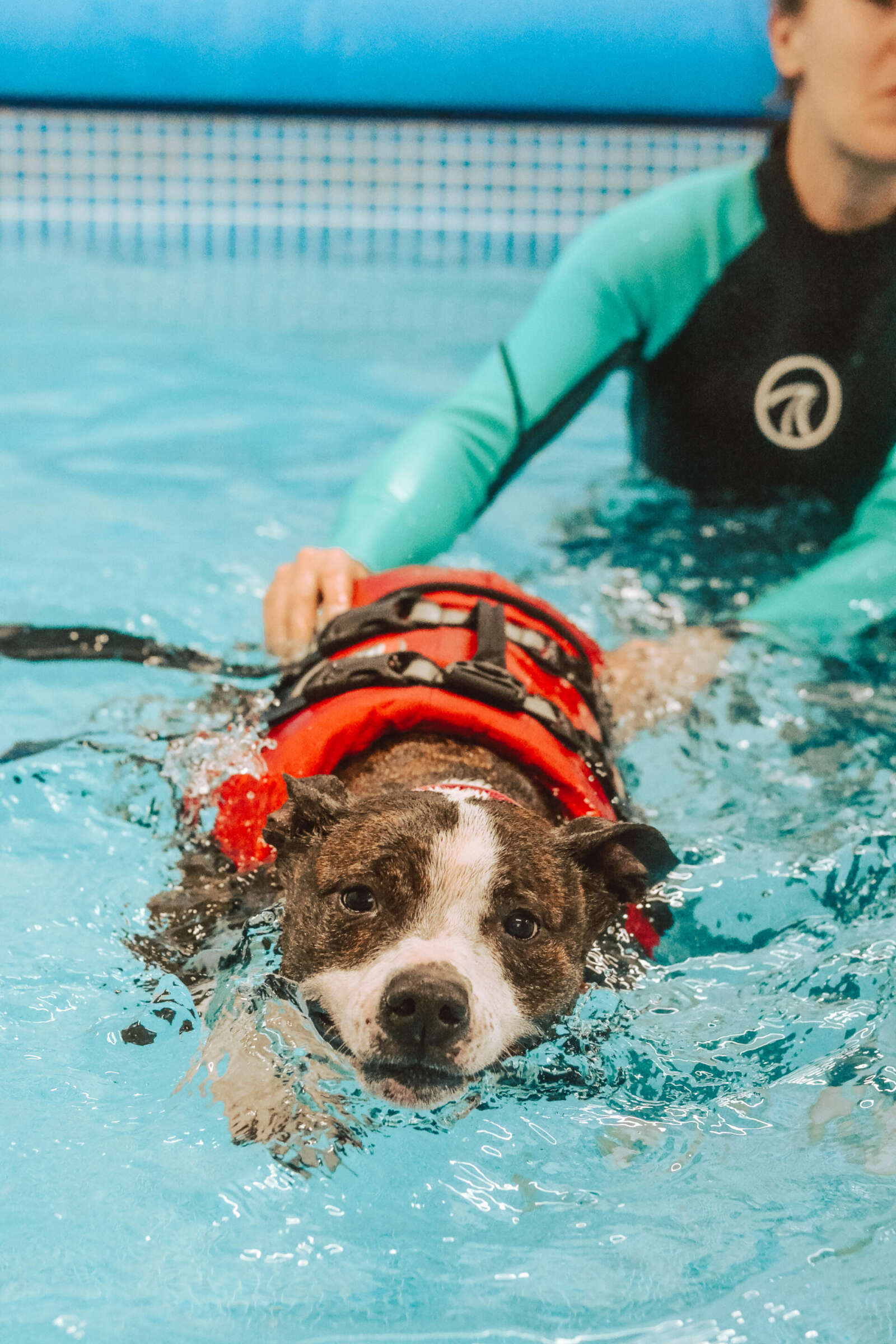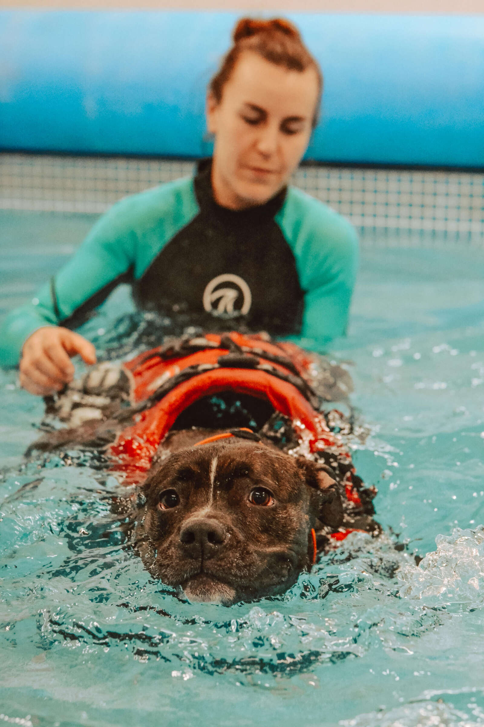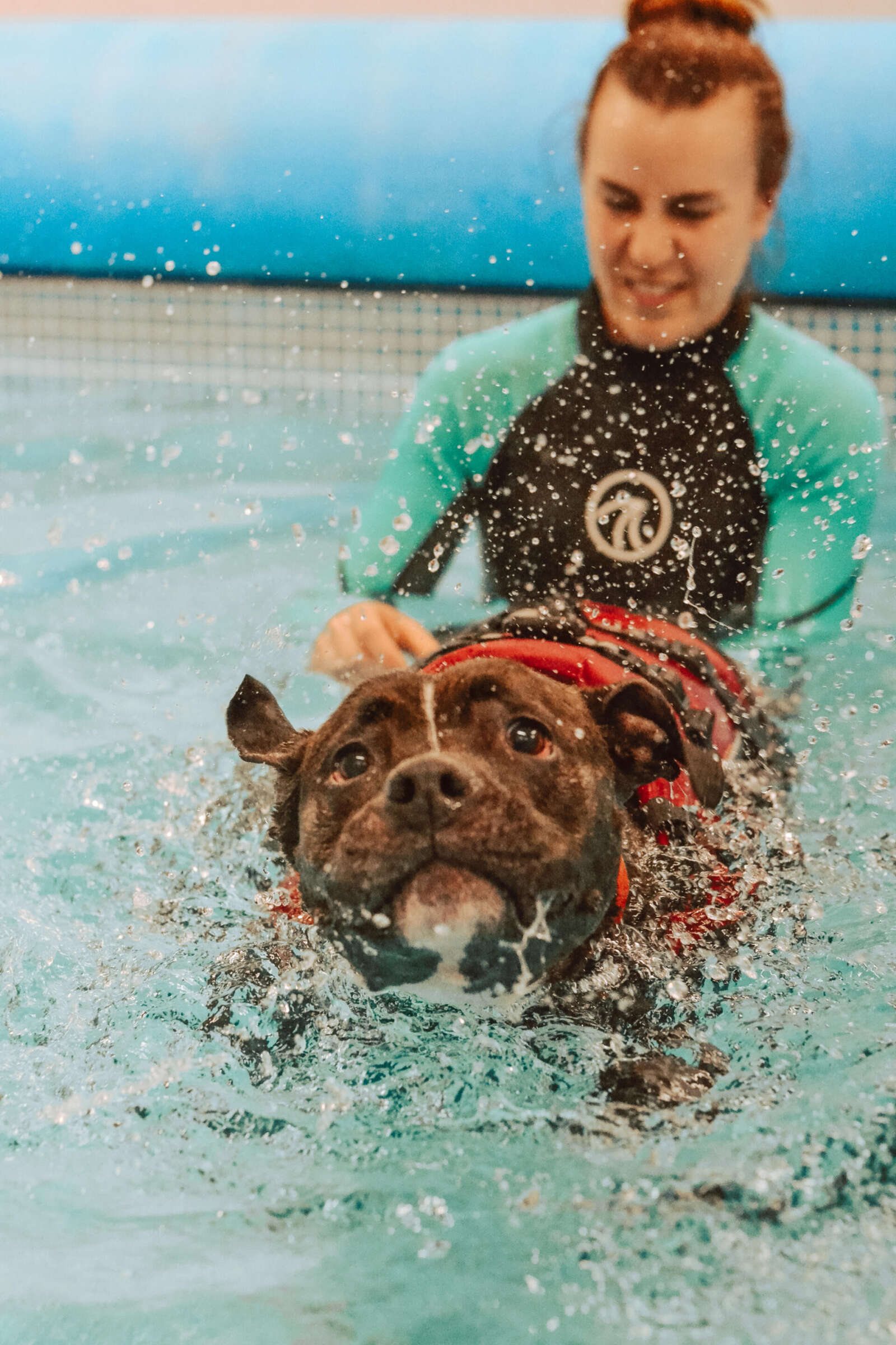 Anya kept a close eye on Phoebe’s pace and form, feeling her shoulders for any signs of injury. Despite never having swam, Phoebe was surprisingly a natural, the ‘least splashy Staffy’ to have been booked into the pool. That’s because the most splashy was scamp number two – Frank – who wasn’t supposed to be joining in the session, but decided to dive-bomb into the pool fuelled by curiosity and serious FOMO (fear of missing out).