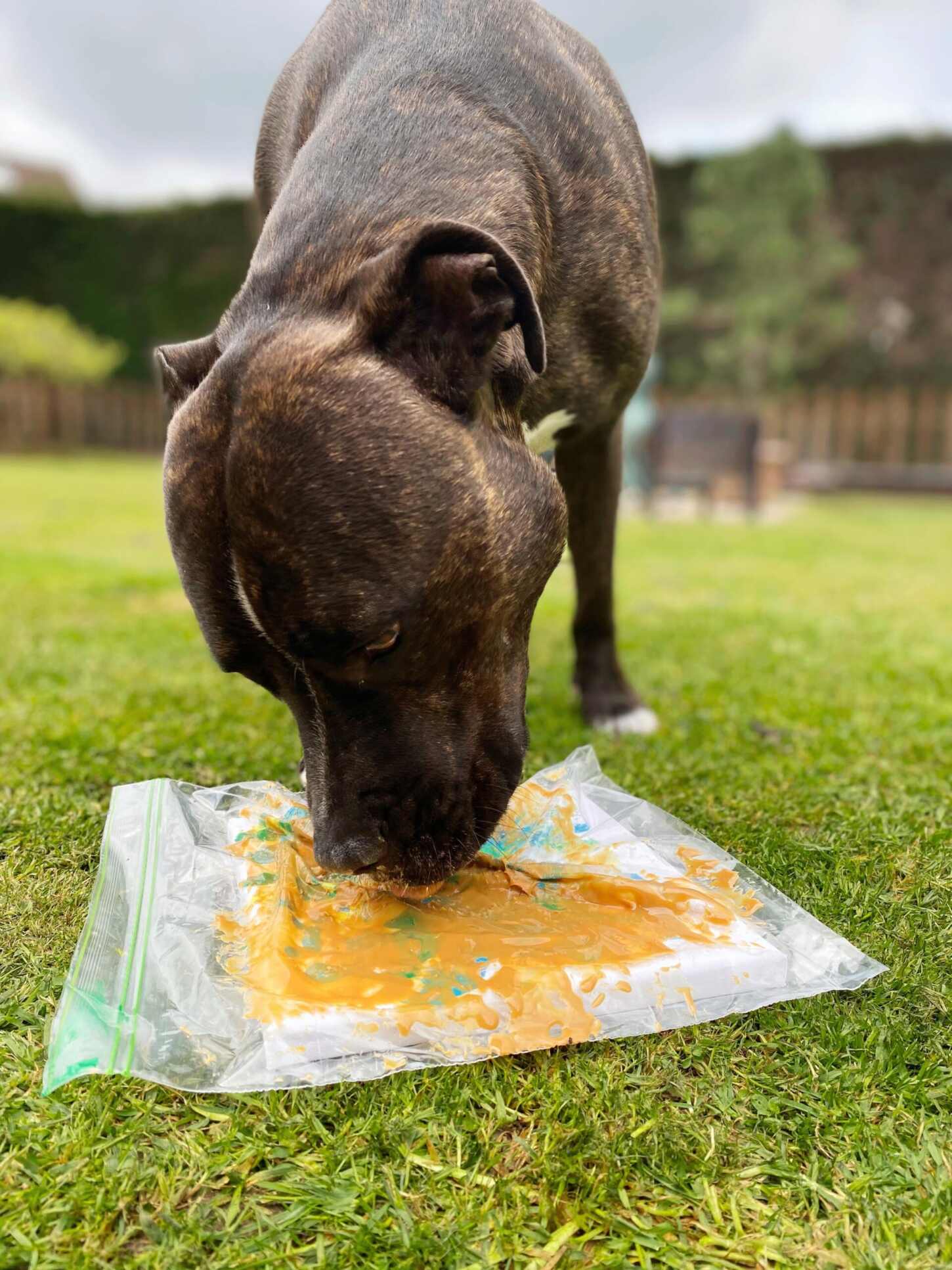 Phoebe got straight to work with her masterpiece, although Frank wasn’t sure about the activity. If he were a human, he was definitely that kid at primary school that cried about putting their hands in PVA glue. After seeing how much fun Phoebe was having, though, he did have a go – but Phoebe finished off his artwork for him, like the bossy madam she is. Licking at the peanut butter spread the paint across the canvas, and because it was acrylic, it also had some cool texture from the plastic bag.