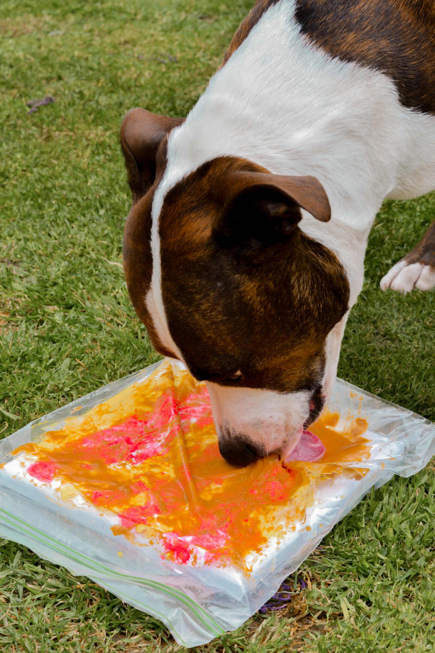 When there was enough paint on the canvases, I moved on to preparing the sandwich bags. I spread a tablespoon of xylitol-free peanut butter onto one side of each bag, carefully unsealed them, and slipped in the canvases. Be sure to seal them back up tightly, so that your dog can’t access the paint.