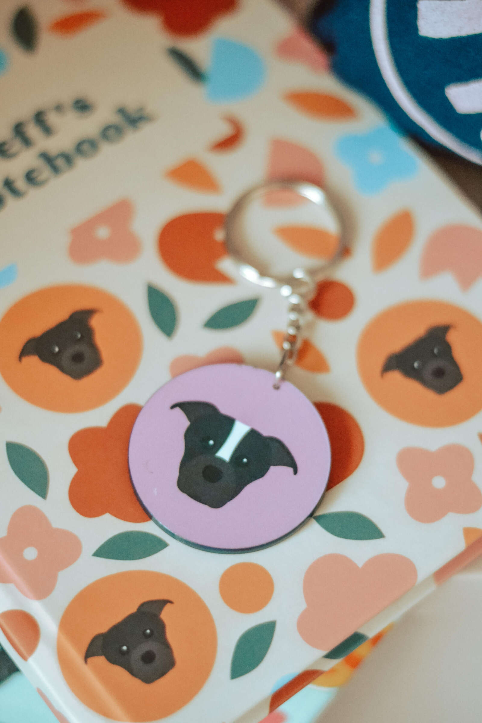 With a colourful abstract print on a lilac background, one side of this keyring reads ‘Crazy Dog Mum’ while the reverse features a little icon of Frank.