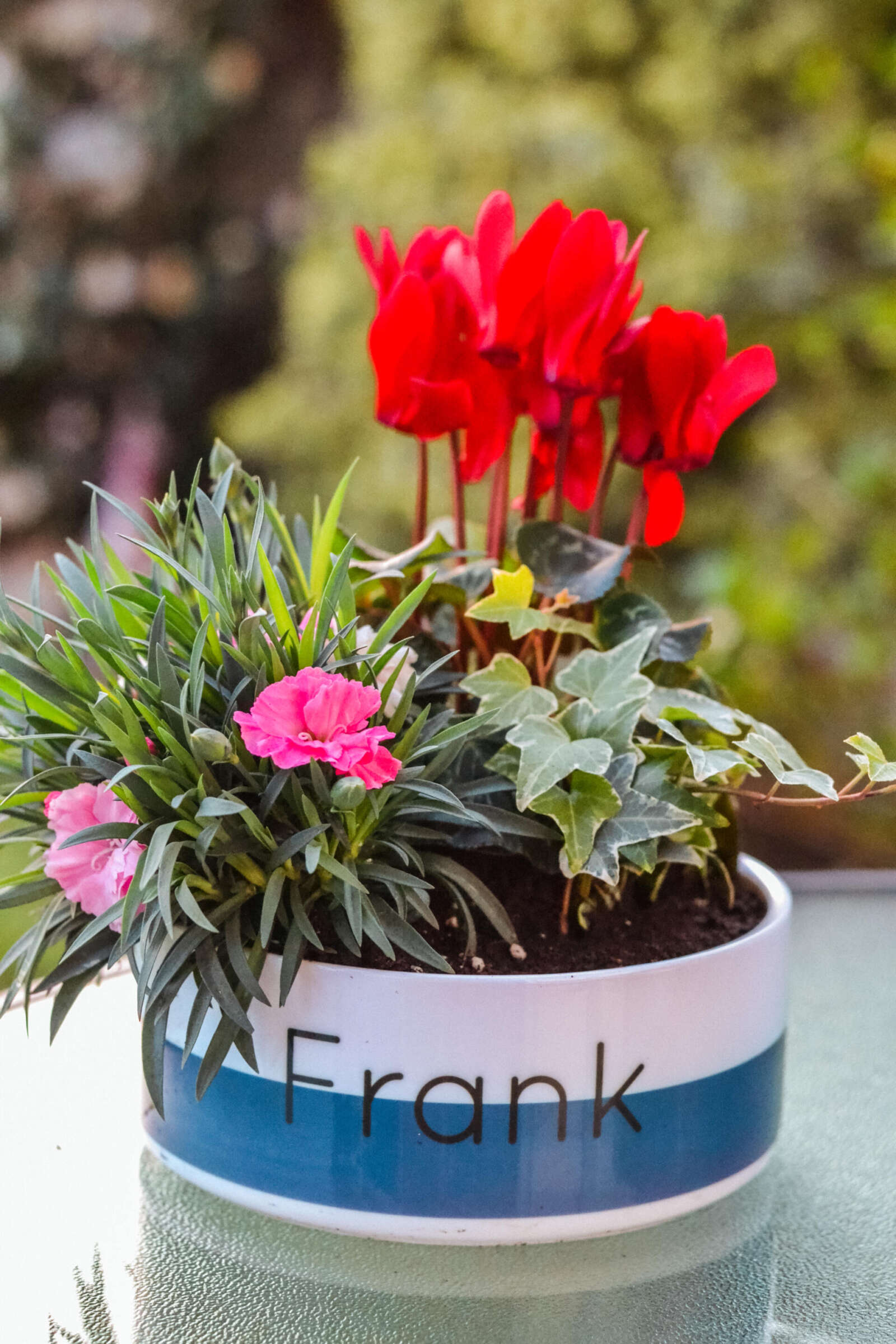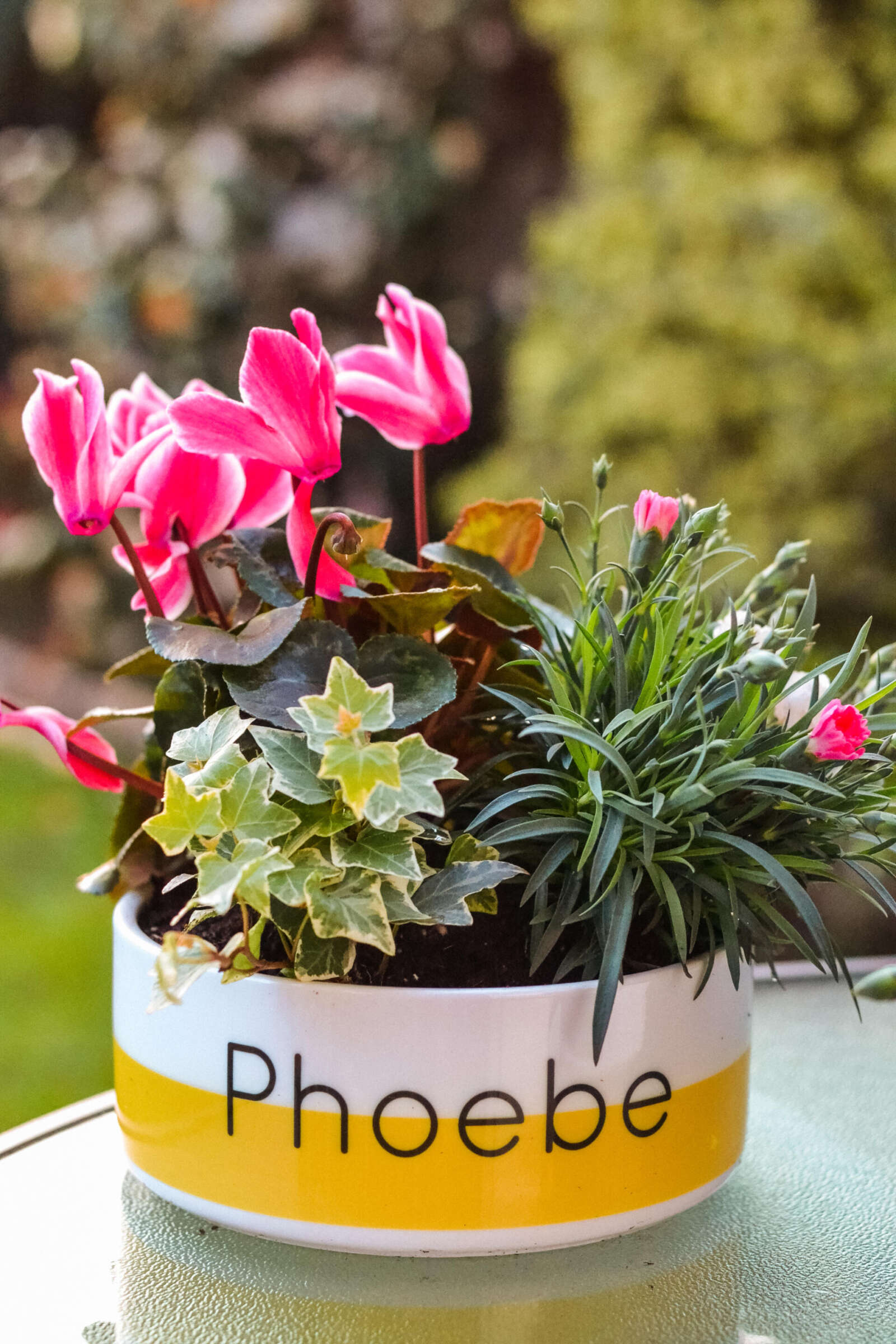 We filled our planters starting with the tallest cyclamen at the back, with the ivy trailing over the edge at the front. After patting in the compost to make sure everything was properly planted, I gave it a good water, and found the perfect spot for it in the garden where we could admire it every time we were outside in the sun.