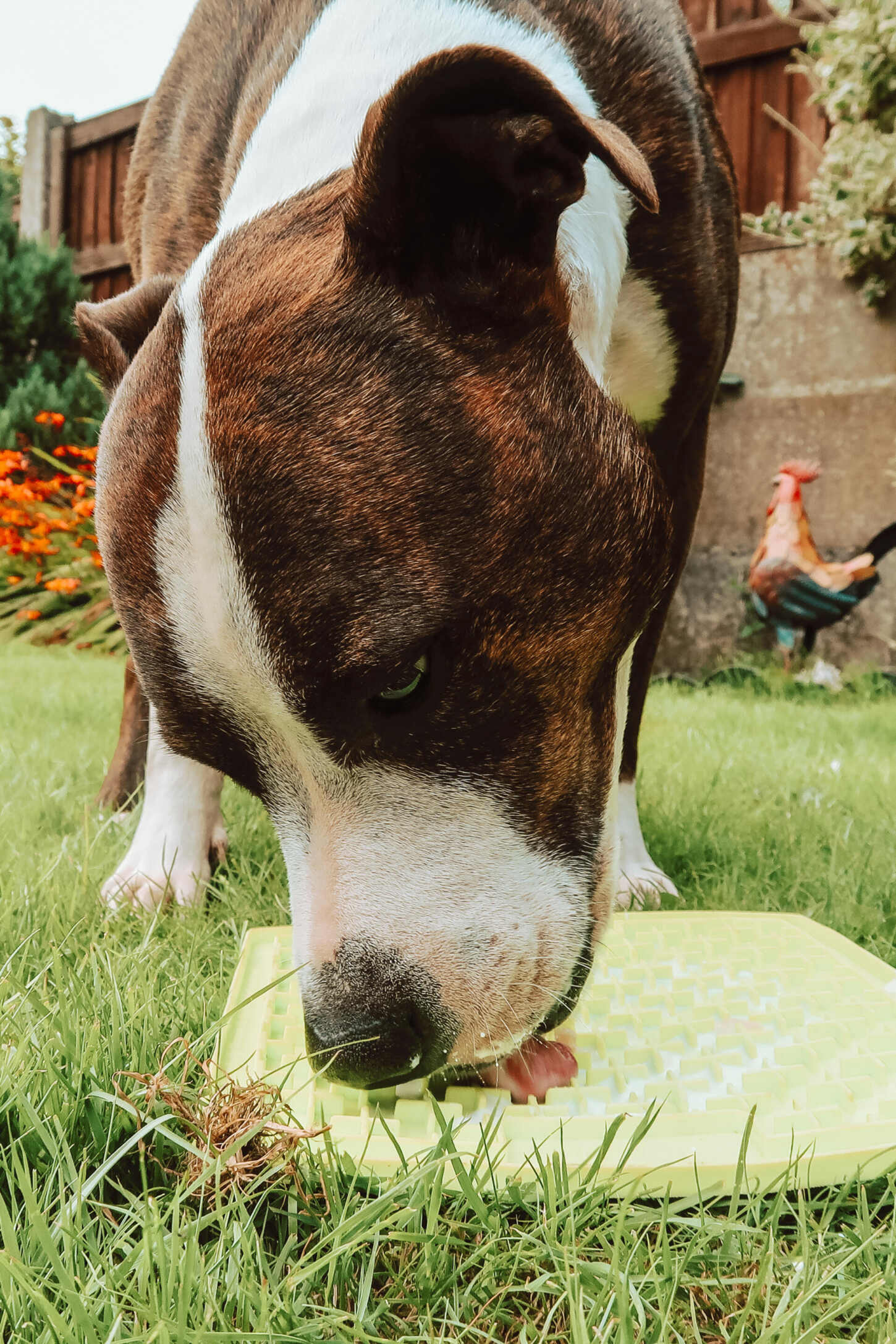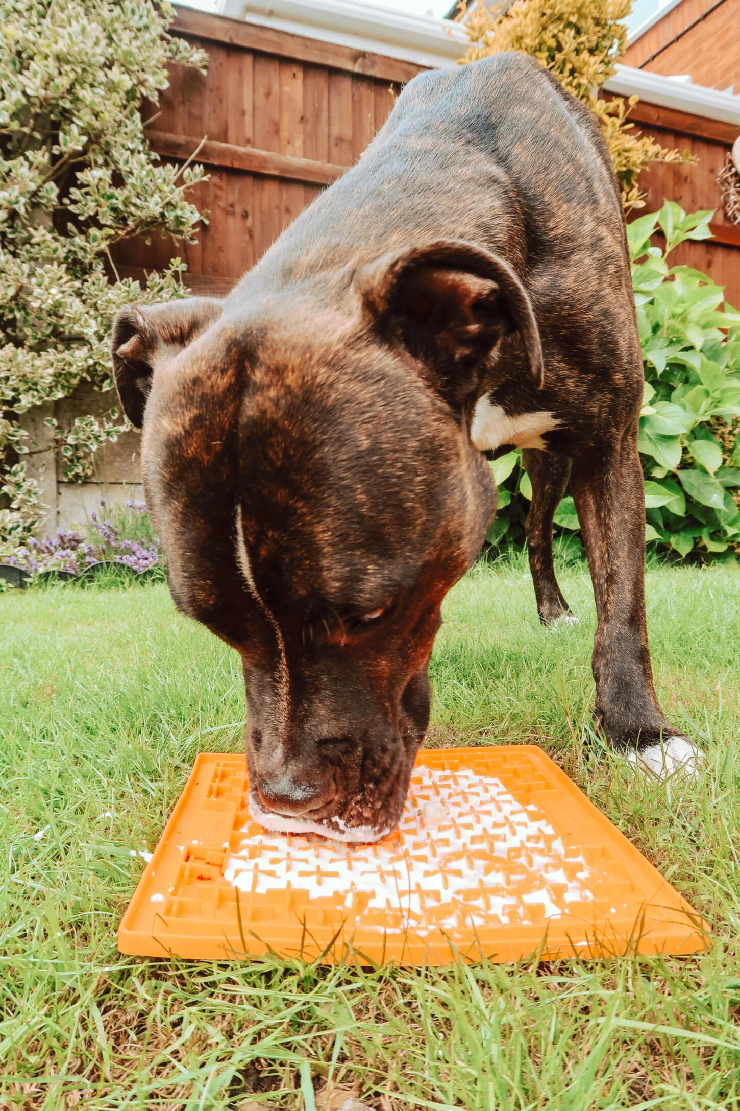 There was still some of the piña colada mixture left in the blender, so I poured it over Phoebe and Frank’s Lickimats and let them enjoy it in the garden – though this could have also been frozen for an enriching, longer-lasting treat.