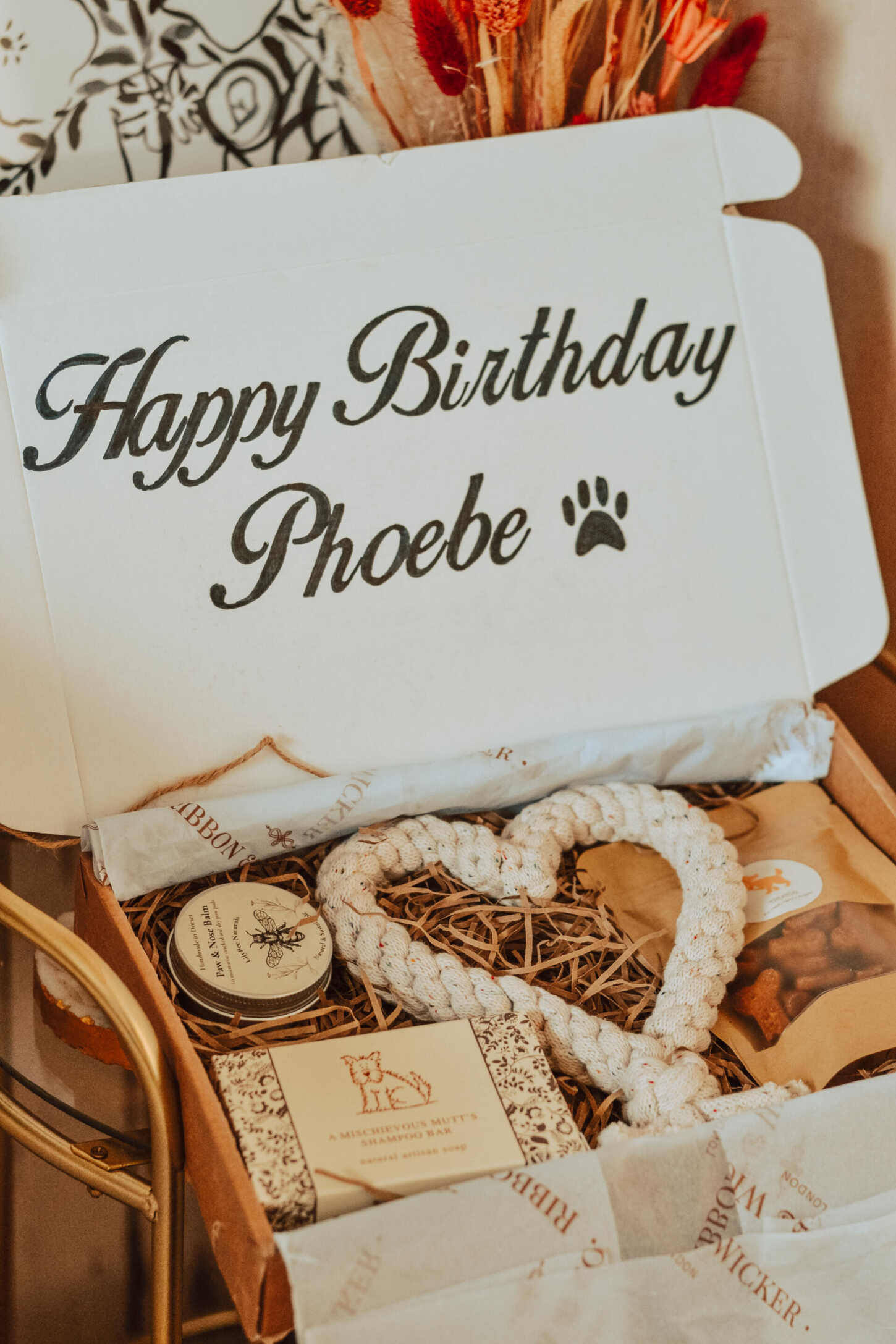 Tied with twine for a rustic look, personalised with ‘Happy Birthday Phoebe’ on the inside of the box, the £30 hamper features four gorgeous gifts including toys, treats and grooming products.
