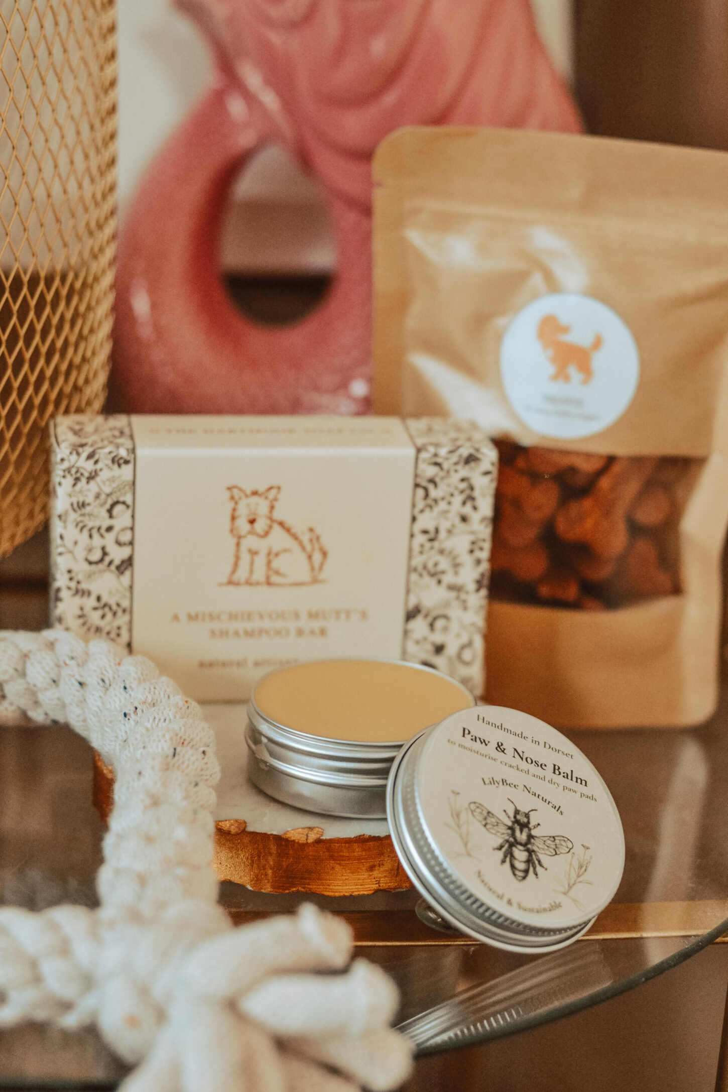 Inside the hamper is a shampoo bar, paw and nose balm, toy and treats, all from different indie businesses on a mission to product high quality eco-friendly products for pets.