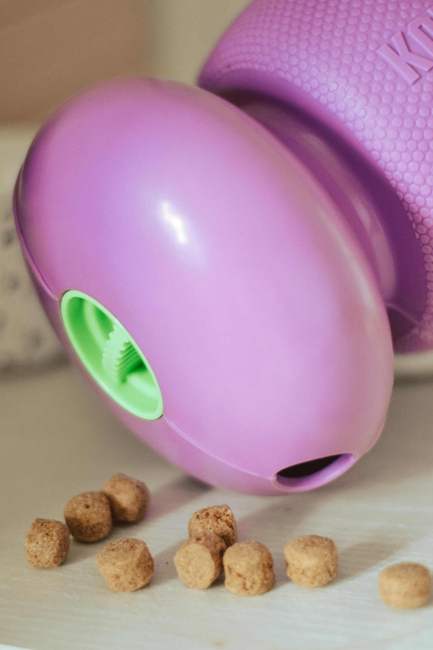 The KONG Replay looks like a purple dumbbell and comes in two sizes – we got the larger version for Phoebe and Frank. There are two green stoppers on either end of the toy for filling each side with treats, with two holes for the treats, or kibble, to dispense. The centre of the dumbbell features a weight, which means when the toy rolls along the ground, it rolls back towards the dog, releasing more rewards.
