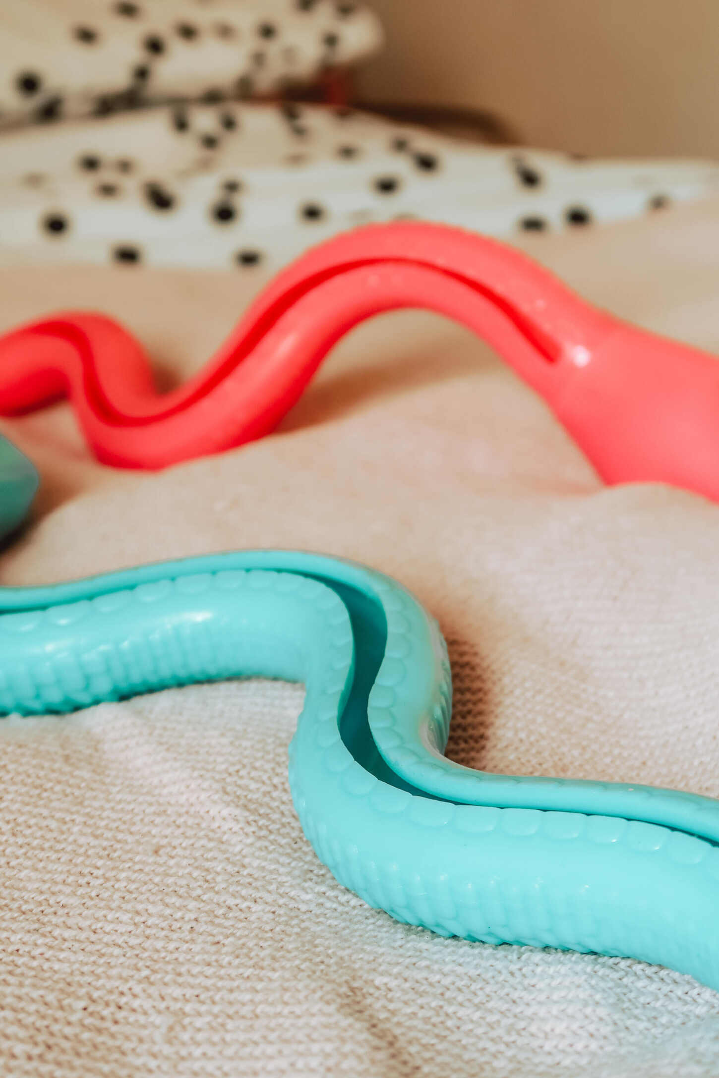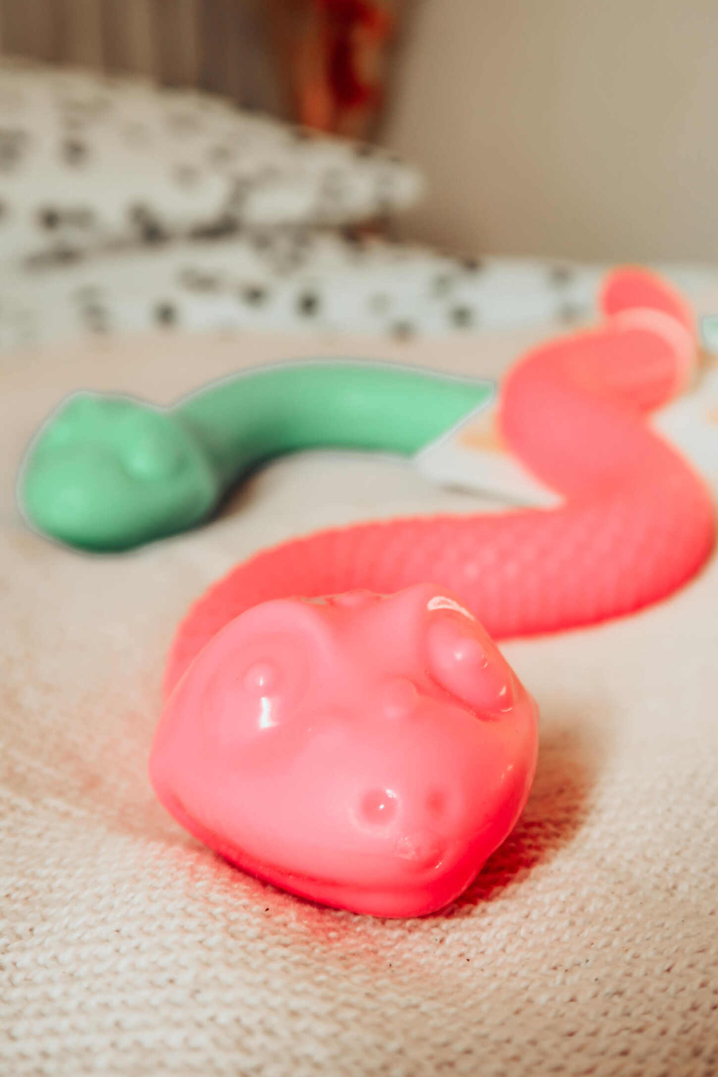They come in three different colours, so we got blue for Frank and pink for Phoebe, but you can also get one in green. The rubber doesn’t seem overly tough and the snake is very bendy, so I wasn’t expecting much from them besides a quick 10 minutes of brain training.