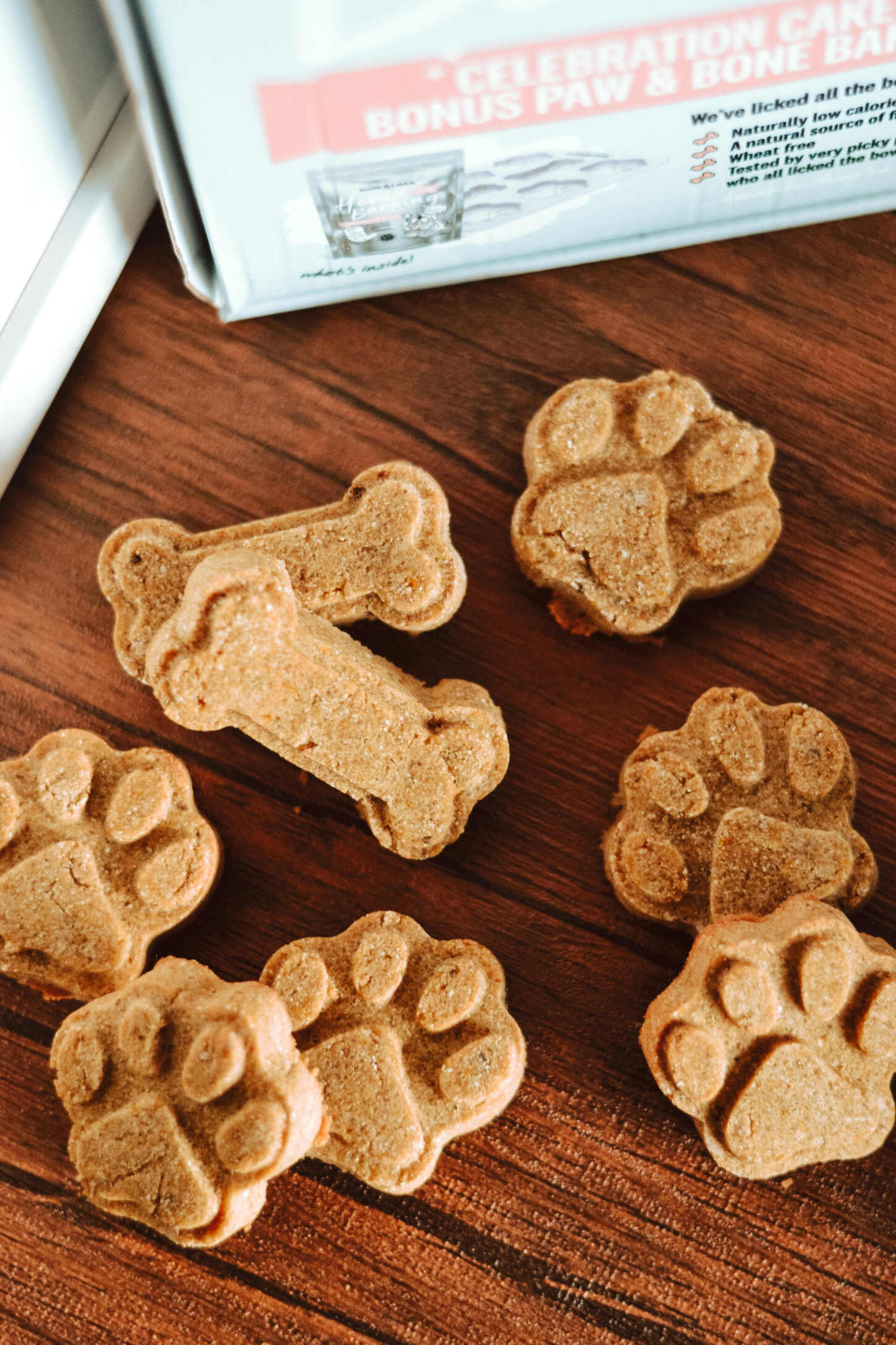 Usually when baking my own biscuits, I end up with a super lumpy mixture and a really sticky dough, but the consistency of the Sniffe and Likkit mix was a total dream – exactly like a cake pop. It was mouldable without being sticky or too crumbly, which meant I could get my hands in and start stuffing the silicon mould, pushing the cake mix down to ensure the paw and bone pattern would bake properly. After pressing the mix into the mould, I flattened each one with the back of a spoon before popping them in the oven for about 15 minutes.